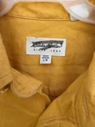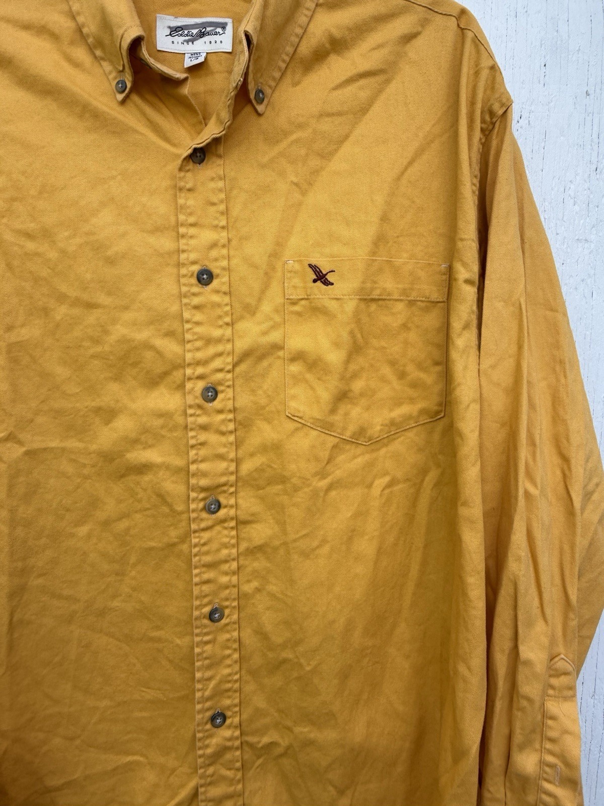The Eddie Bauer 100% Cotton Mustard Heavy Duck Material Long Sleeve Button Men Shirt is a versatile and durable button-up shirt perfect for travel, casual wear, and business occasions. Made with woven cotton fabric, this shirt features a collared neckline, button-down collar style, and long sleeves for added warmth during the winter, fall, and spring seasons. With a solid mustard color and Eddie Bauer branding, this shirt is a classic and stylish addition to any man's wardrobe, offering easy care and convenient pockets for added functionality. Perfect for those looking for a regular fit in size L/G with a chest size of 52". Wrinkles