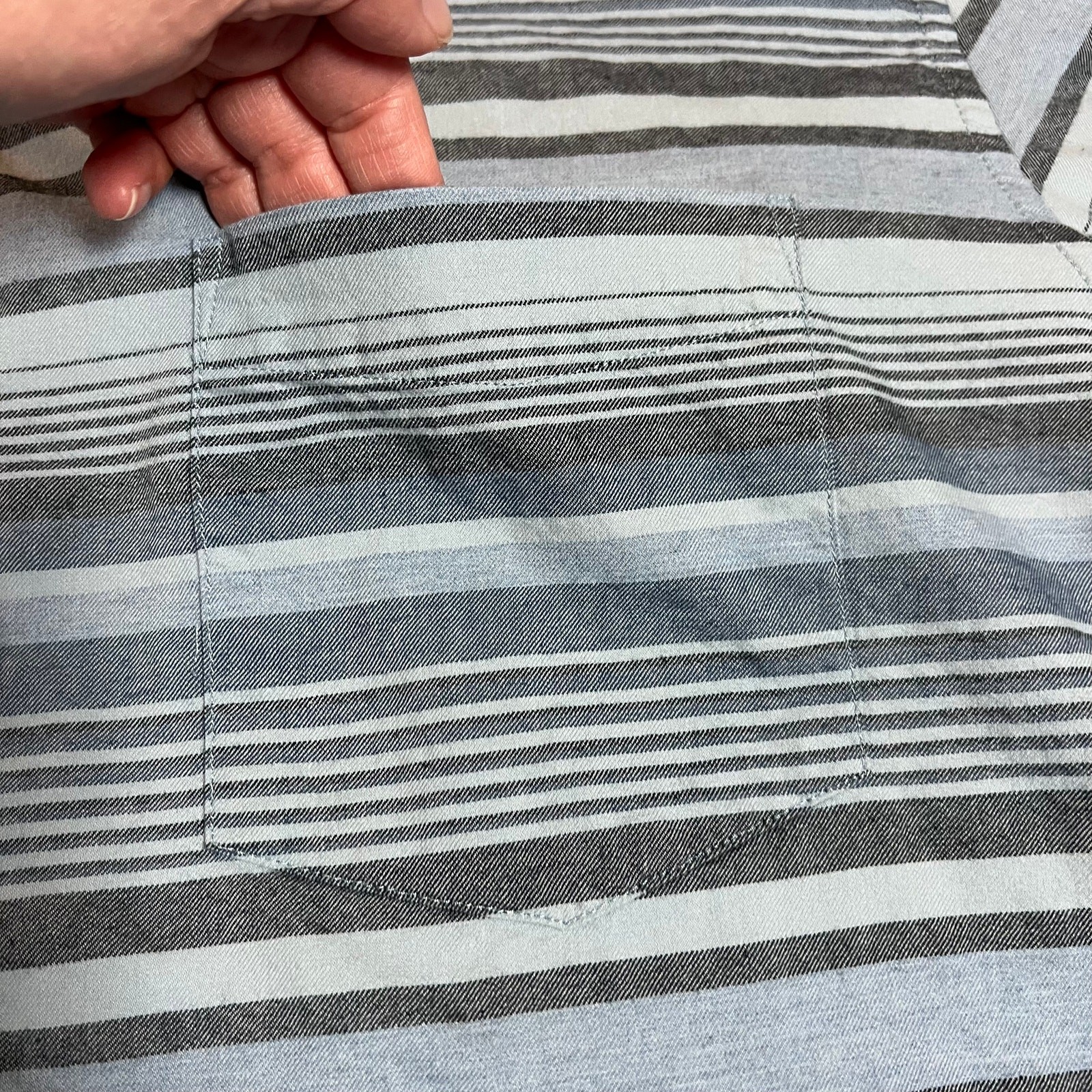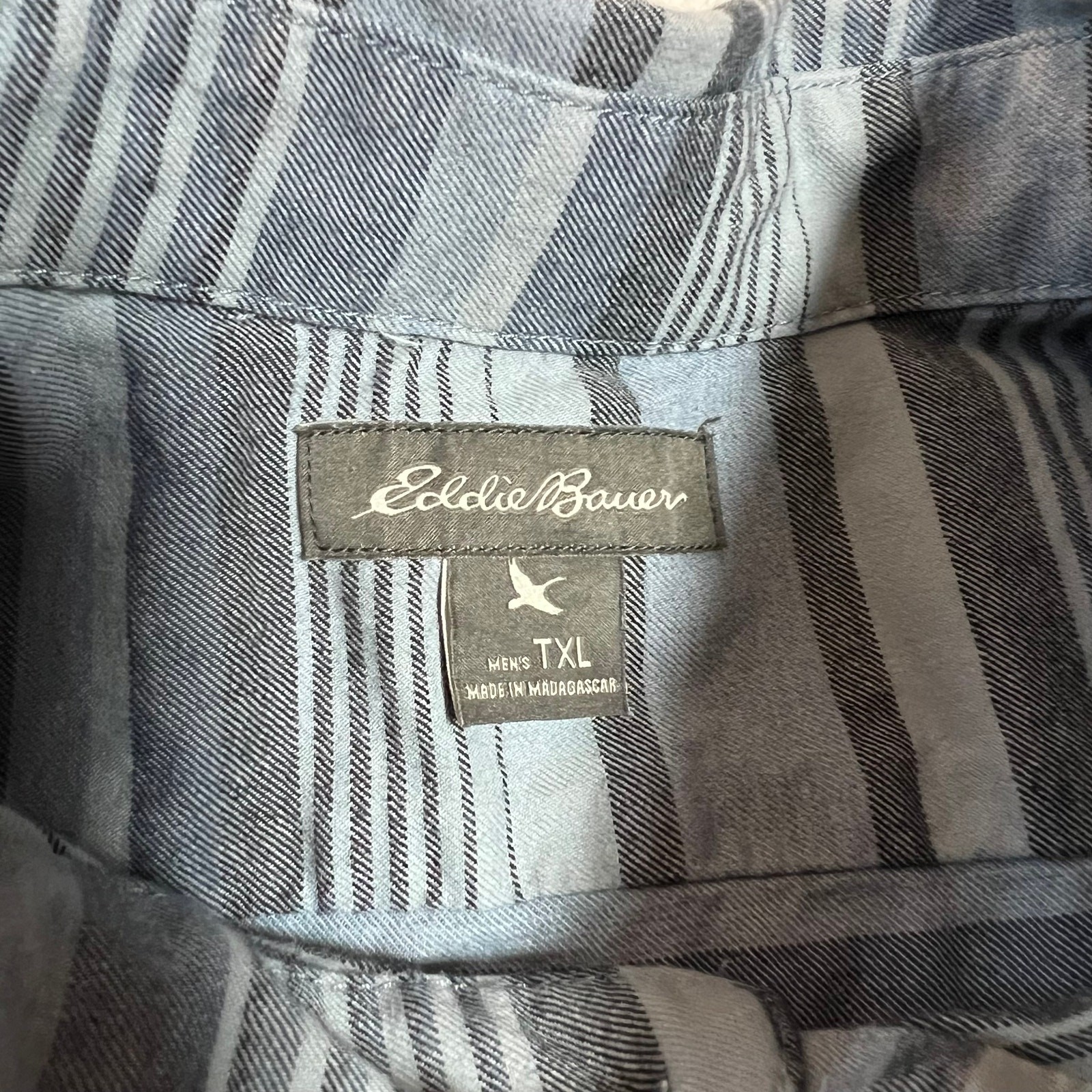 This shirt is a fantastic find! The lightweight cotton is super breathable, perfect for warm days. The tall X-large size fits just right, and the classic blue stripes make it versatile for any casual occasion. Even though it's pre-owned, it looks brand new—no flaws at all. The single chest pocket is a nice touch, and the long sleeves roll up easily. Great quality from Eddie Bauer, as always. Highly recommend!