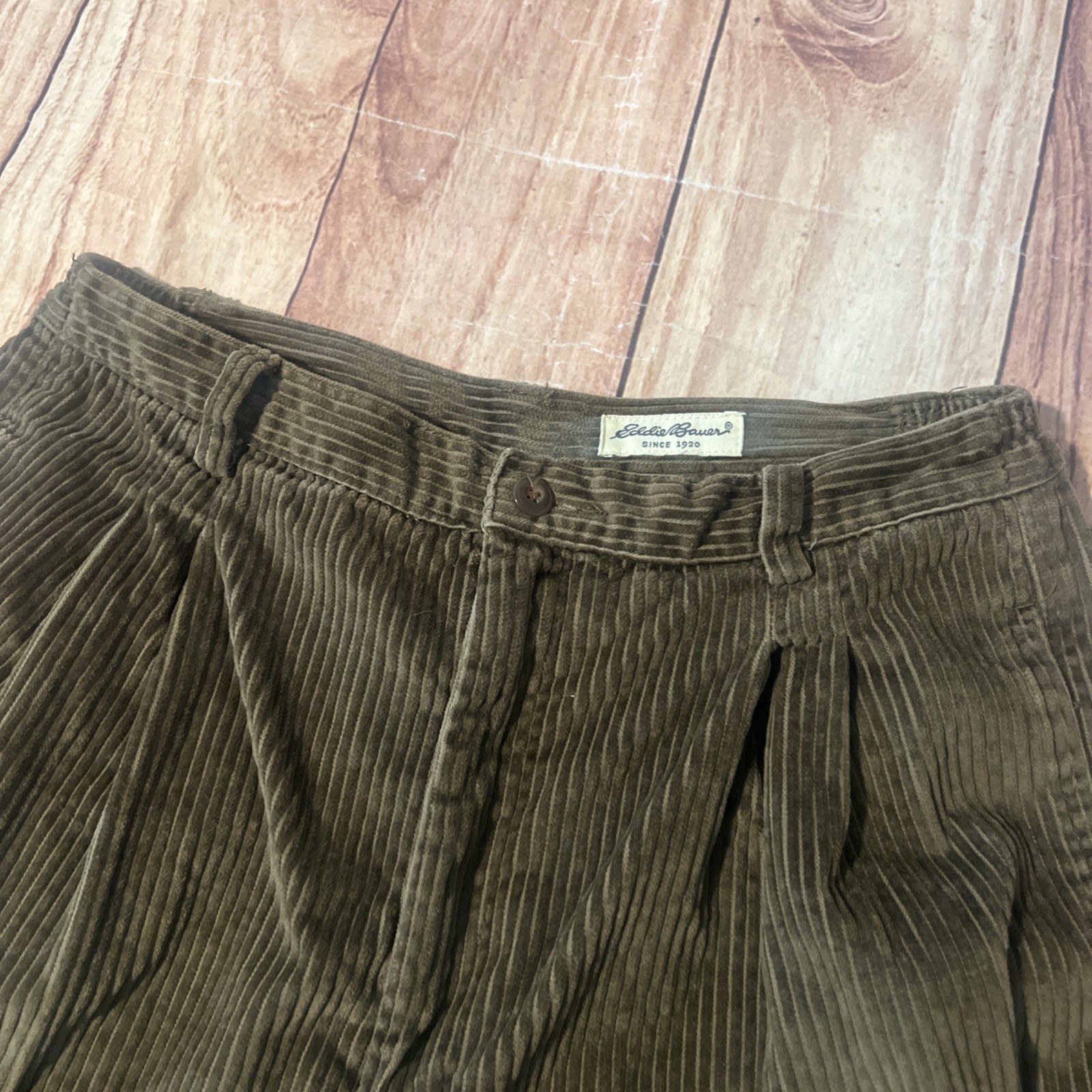 The Eddie Bauer Women's Corduroy Pants in Olive, Size 12 Boyfriend, offer a relaxed and straight leg fit for a comfortable and stylish look. Made from a blend of spandex and cotton corduroy fabric, these pants feature a solid pattern with a mid-rise waist and zip/button closure. With a 31-inch inseam and stretch feature, these chino-style pants are machine washable for easy care, making them a versatile addition to any woman's wardrobe.
