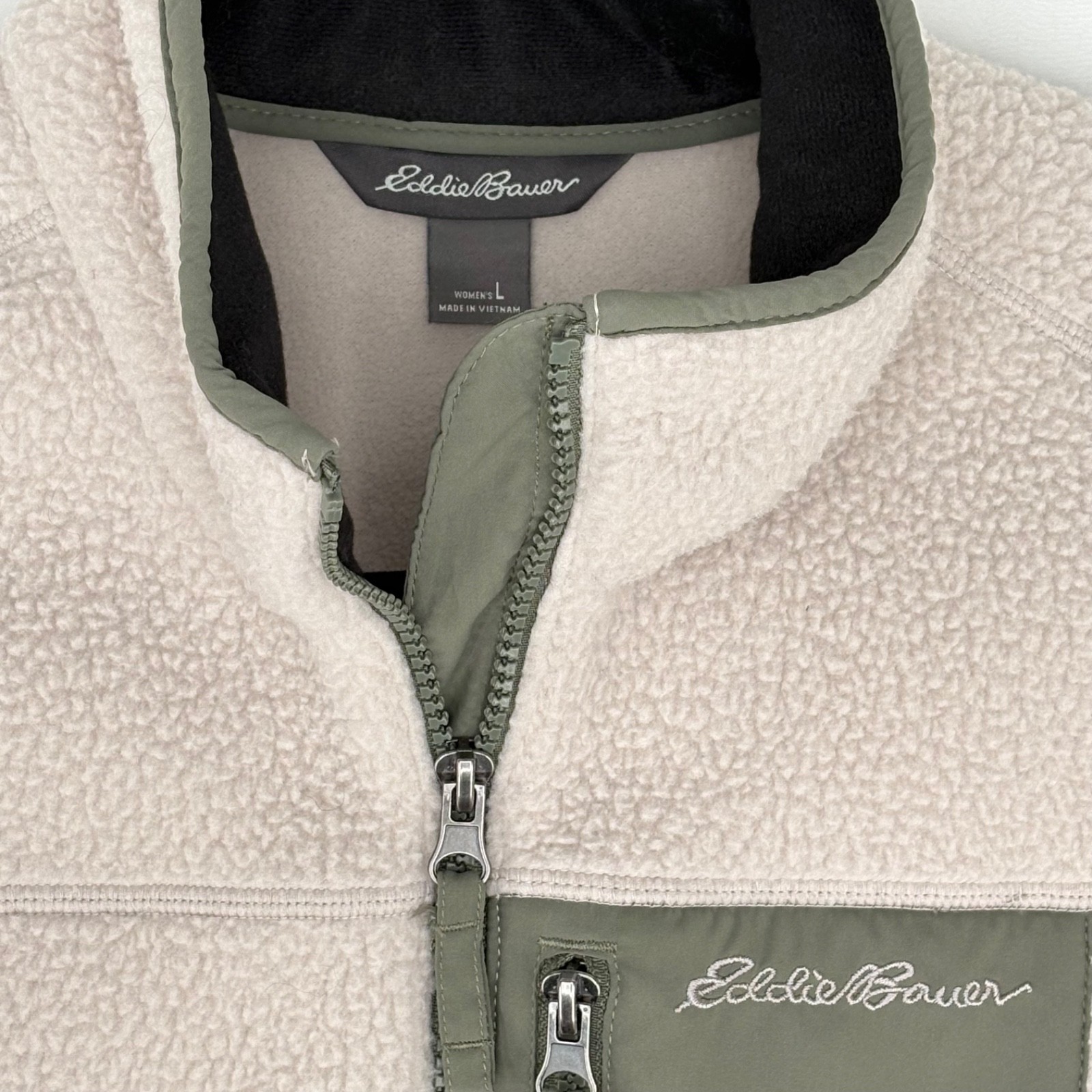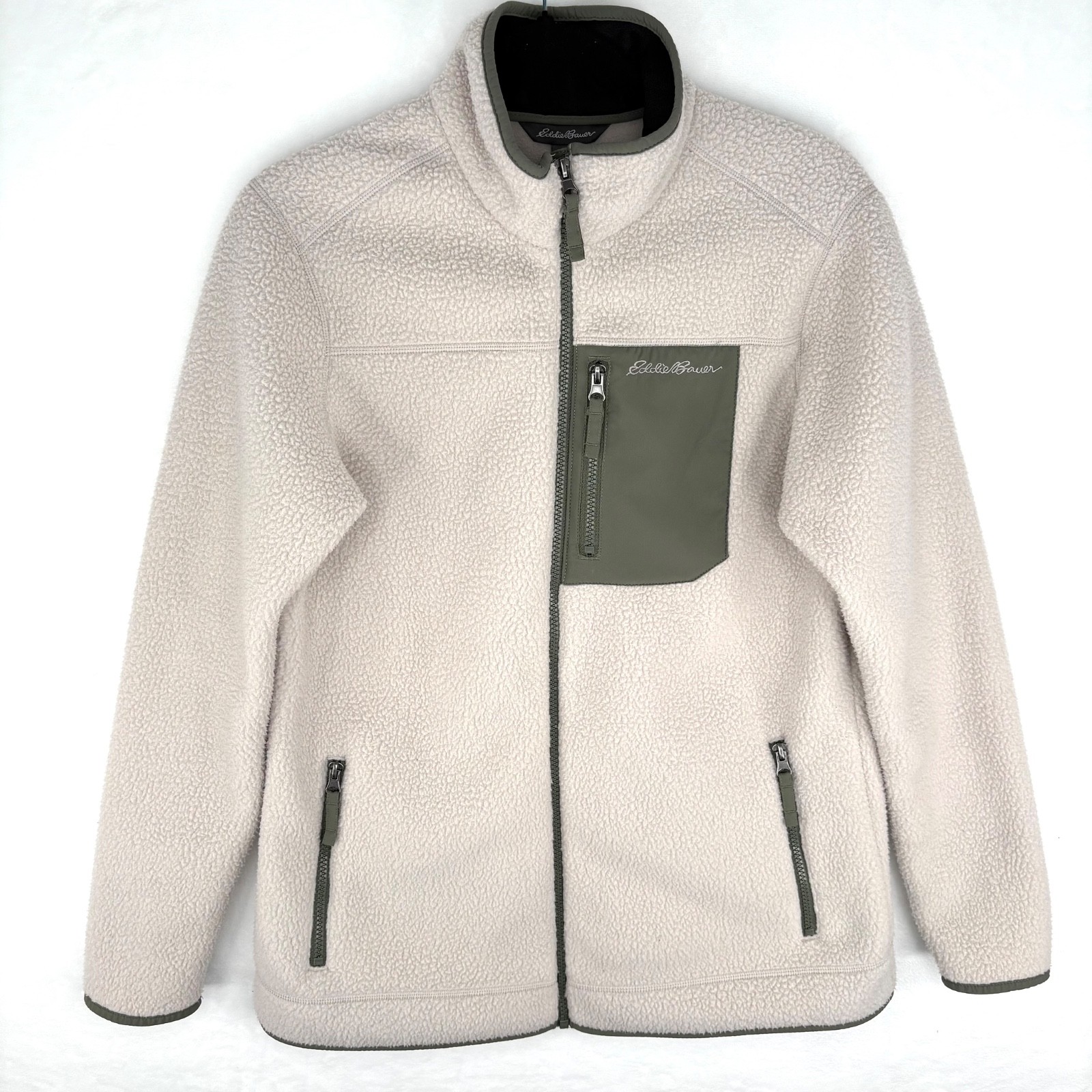 Cozy comfort meets practical style with this Eddie Bauer fleece jacket. The soft, plush fleece invites you into a world of warmth, perfect for layering on chilly days or wearing as a standalone piece during milder weather. Design details include a full-zip front for adjustable ventilation, a stylish mock neck that shields against the wind, and thoughtfully placed pockets that offer secure storage for essentials or a cozy refuge for your hands. A great choice for morning hikes, casual coffee runs, or relaxing evenings by the fire. Keywords: Eddie Bauer, fleece jacket, womens jacket, full zip, mock neck, beige jacket, green accents, pockets, outdoor, casual, warm, cozy, layering, fall fashion, winter wear Please see photos for measurements. We truly appreciate your interest in our listing. Every item is carefully curated, precisely measured, and packed with care to ensure it reaches you in great condition. Your satisfaction means the world to us, and we're committed to providing a smooth and positive shopping experience. If you have any questions, please don't hesitate to reach out! Thanks for stopping by. Wishing you a wonderful day and happy shopping! Sincerely, Denari Threads
