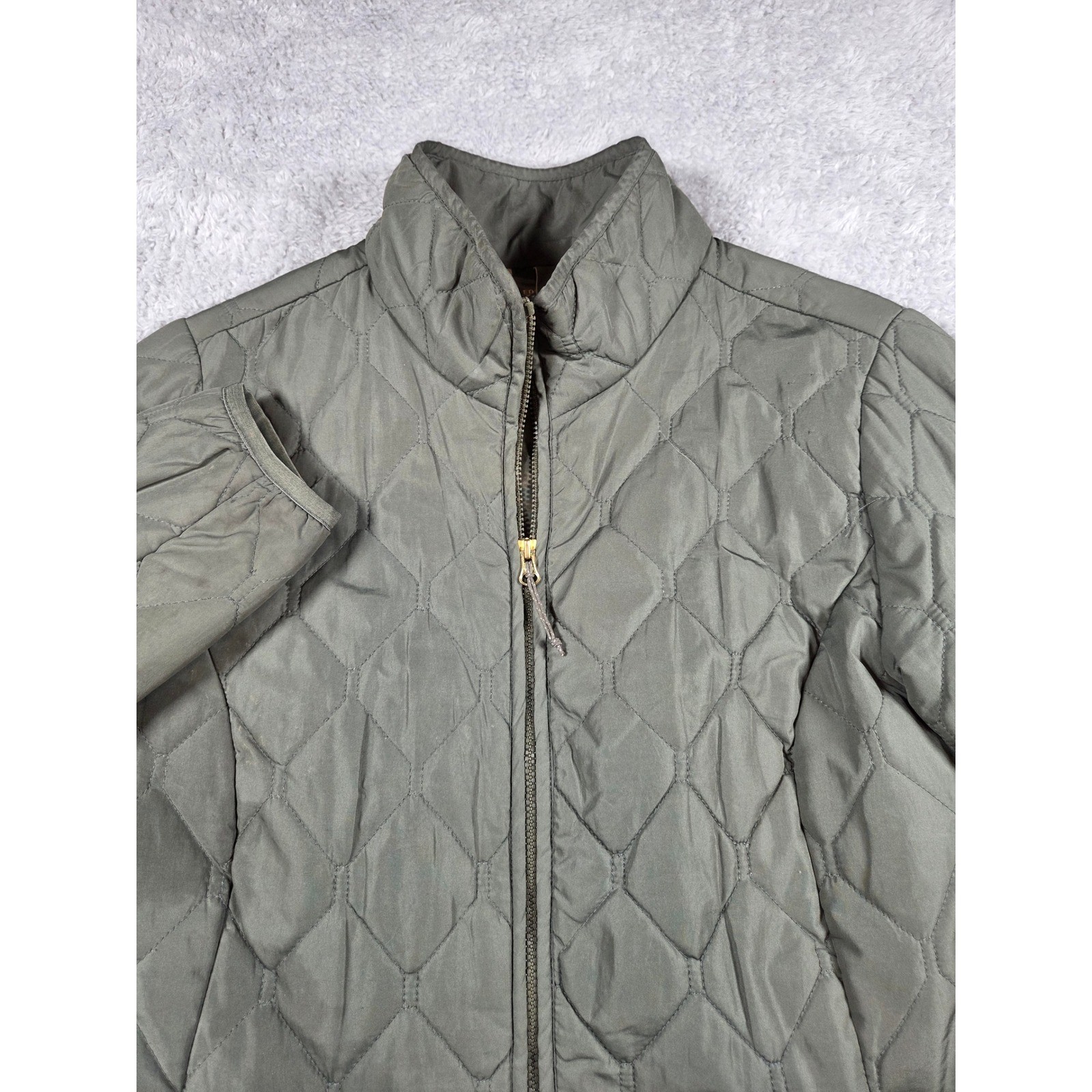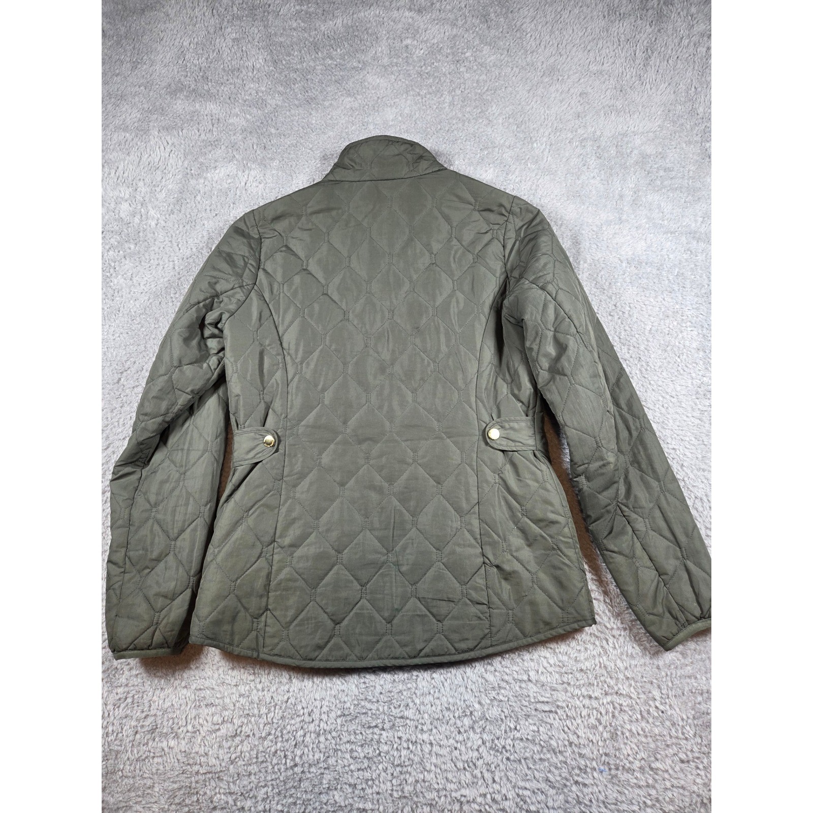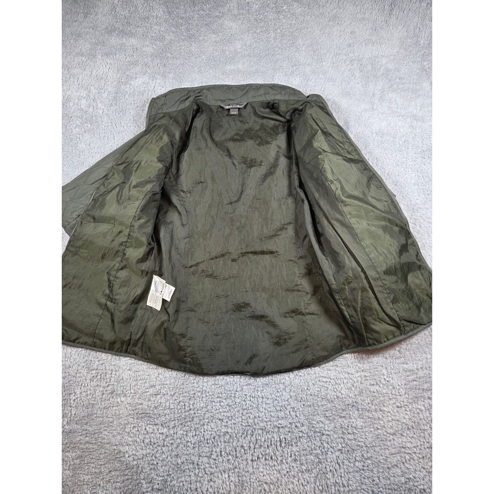 Eddie Bauer diamond-quilted jacket in a versatile olive green hue provides a classic outdoor aesthetic. This lightweight piece features a full-zip front, a stand-up collar, and a flattering cinch-back detail with gold-tone snap buttons. Designed with two front pockets and subtle brand embroidery, it is crafted from a durable polyester shell and lining with light insulation for seasonal layering. This item is in excellent pre-owned condition. Keywords: Equestrian, Countryside, Barn Jacket, Quilted, Lightweight, Transitional, Utility, Classic, Preppy, Outdoor, Gorpcore, Minimalist, Earth Tones, Layering, Casual All items come from my family's and my personal collection. Some show loving wear, others were lightly used, and a few are new with tags. Toys and collectibles are also from past hobbies—please give them a new life. Thank you!