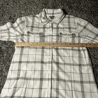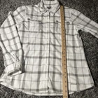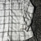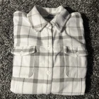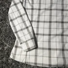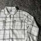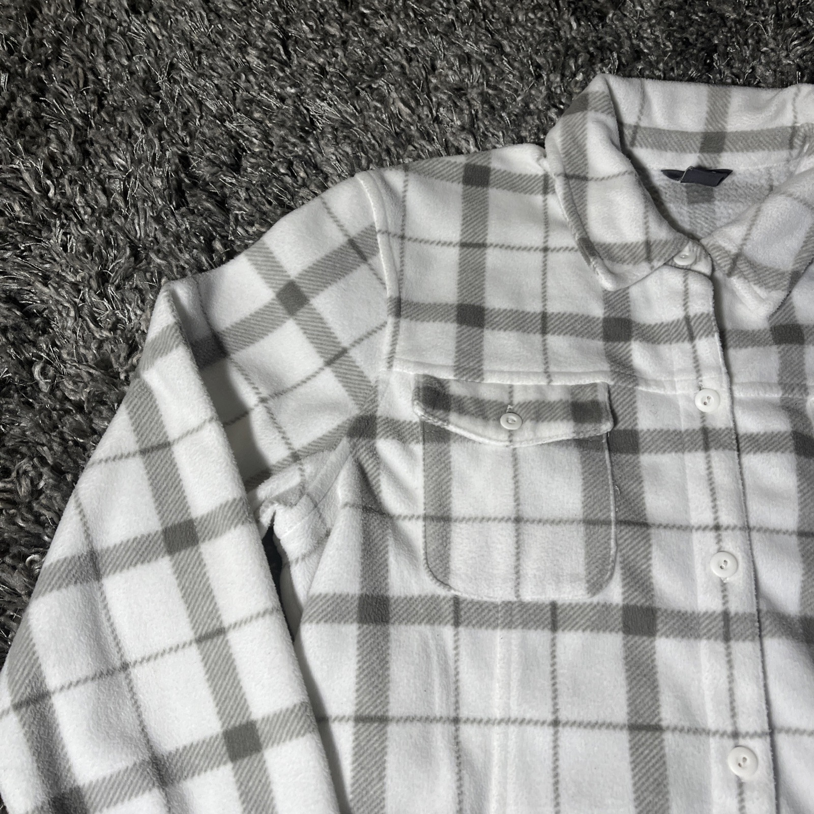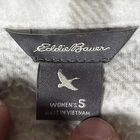 This Eddie Bauer shacket is a stylish and cozy piece for women in size small. The shirt features a white plaid pattern with a collared neckline and button-up closure, making it suitable for travel, casual outings, or workwear. Made of plush fleece material with a casual sleeve design, this shacket is easy to care for with machine washable properties. It also includes practical pockets and the Eddie Bauer logo accent for a classic outdoor-inspired look, perfect for the winter, fall, and spring seasons.