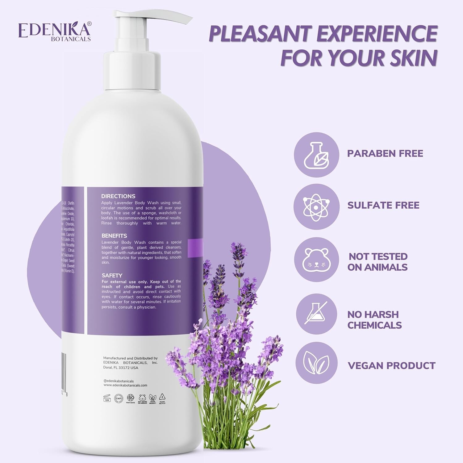 Relaxing Lavender Formula – Infused with calming Lavender, this body wash transforms your shower into a spa-like experience, helping to relax your mind and body. Nourishing Blend of Natural Oils – Enriched with Chamomile, Grapeseed, and Almond Oil, it helps hydrate, smooth, and improve skin texture for a radiant, healthy glow. Vegan & Free from Harsh Chemicals – This sulfate-free, paraben-free, and cruelty-free formula is made with certified organic ingredients, ensuring a clean and gentle cleanse for your skin. Safe for All Skin Types – Ideal for sensitive and delicate skin, this body wash works as a natural hydrator to nourish and moisturize without irritation, suitable for both men and women. Eco-Friendly & Made in the USA – Crafted with sustainable packaging and certified organic ingredients, this body wash is made in the USA and encourages environmentally friendly practices.