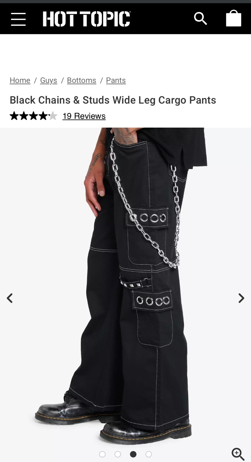 These are Black Chains & Studs Wide Leg Cargo Pants by Hot Topic. They are made of cotton denim with studded accents. The pants have a wide-leg style and feature cargo pockets. They are designed for unisex adults in size 30Wx32L. (Missing Chain)