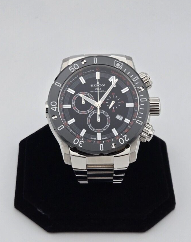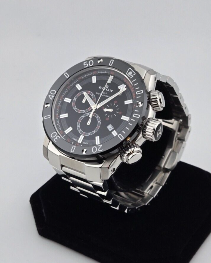 Edox Chronoffshore-1 Men's Black Dial Chronograph Watch 10221 3M NIN $1860 MSRP With Gift Box! This watch is a Shelf Pull from one of the Major Department Stores. Watch has micro scratches on the watch case/band, visible under direct light. Experience the perfect combination of ruggedness and precision with the Edox Chronoffshore-1 Men's Chronograph Watch. Crafted from durable stainless steel, this watch features a robust case and a matching stainless steel bracelet, making it ideal for both adventurous outings and everyday wear. The uni-directional rotating black ceramic bezel adds a modern touch, while the striking black dial showcases luminous silver-tone hands and index hour markers for easy readability in any lighting. The Edox Chronoffshore-1 is designed for performance, equipped with a reliable quartz movement that ensures accurate timekeeping. Its chronograph function includes three sub-dials that display 60 seconds, 30 minutes, and 12 hours, providing you with essential timing capabilities. The date display at the 4 o'clock position adds practicality to its sophisticated design, while tachymeter markings around the outer rim offer additional functionality for speed calculations. With a case size of 45 mm and a thickness of 13 mm, this watch commands attention without compromising comfort. The scratch-resistant sapphire crystal ensures durability, and the solid case back enhances its robustness. Designed to withstand aquatic adventures, the watch is water-resistant up to 300 meters (1000 feet), making it perfect for diving and water sports. The deployment clasp provides a secure fit, ensuring that the Edox Chronoffshore-1 is not just a watch but a reliable companion for any journey. Features Stainless steel case with a stainless steel bracelet. Uni-directional rotating black ceramic bezel. Black dial with luminous silver-tone hands and index hour markers. Minute markers. Tachymeter markings around the outer rim. Dial Type: Analog. Luminescent hands and markers. Date display at the 4 o'clock position. Chronograph - three sub-dials displaying: 60 second, 30 minute and 12 hour. Quartz movement. Scratch resistant sapphire crystal. Screw down crown. Solid case back. Round case shape. Case size: 45 mm. Case thickness: 13 mm. Band width: 25 mm. Deployment clasp. Water resistant at 300 meters / 1000 feet. Functions: chronograph, date, hour, minute, second. Fast and Free Shipping You're already purchasing the item. Why pay additional for shipping, especially slow shipping? We get your order shipped out within 1-business day and delivered to your doorstep as quickly as possible. Competitive Pricing With our dynamic pricing model, our prices are always competitive. Our prices are some of the lowest that you will find on the internet. Rest assured that you're getting a good deal when purchasing with us. 30-day Money Back Guarantee We are committed to making sure that you leave this transaction satisfied. If you're unhappy with the product for any reason, you may return it back for your money-back or a replacement within 30 days. No questions asked!