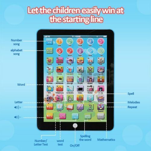 Educational Learning Toys for Kids Toddlers Age 3 4 5 6 7 8 Years Old Boys Girls Kids Children TABLET MINI PAD Educational Learning Toys Gift For Boys Girls Baby √ Ship within 24 hours. √ 100% New & Excellent Quality √ Professional Customer Service . √ Strictly QC, Each set was fully tested before shipping √ Local USPS Fast Shipping From NJ, USA √ Offer delivery with Tracking Number Features: *Made of non-toxic environmental ABS plastic. *Simple function,featuring with Volume +, Volume -, just turn on ON/OFF function,then gentle press, easy for children to operate *No LED which is harm to kids' eyes. *Learning and playing content:Provides funny ways for children to learn 26 A-Z Alphabet Letters, Words Learning and Spelling, Color Learning, Animal Learning, Fruit Learning,Food Learning, Alphabest song and Number song. *Developing baby's emotion,hearing,grip,sensory,hand-eye coordination,visual and other abilities *Great gift for baby toddlers boys and girls for Children's Day, Birthday, Christmas Day, New Year. *Lightweight and portable. Attention: 1.After placed the batteries, Press the Home Button it will be turned ON/OFF,then start your learning by press other Icon. 2.NOT Real iPad,Pressed only!!! No slide! 3.Not with LCD Touch Screen, No Wi-Fi, It's a learning type mini ipad to teach babies and kids in a gaming type. 4.Please note it says on package not suitable for children under 3 years, actually it is suitable for kids age 1-3 playing under adult supervision. Specifications: Materials:Environmental ABS Power:3 x AA batteries ( included) Size: 18.4*14.3*1.8cm Package includes: 1x Mini Learning iPad Toy 3 x AA batteries (Free gift,No extra purchase is better than others without batteries) Payment Shipping About Feedback About us Contact us Payment 1. Paypal Accept. 2. Payment should be sent within 4 (FOUR) days auction closing. Or unpaid dispute will be filed for closing auction. Shipping 1. Fast shipping from NJ, US. 2. Shipping available time: Mon. - Fri. exclude holidays 3. The orders will be handled in 24 hours after payment got. Ship to Paypal Address ONLY. About Feedback If you are dissatisfied for any reason, please do not be quick to leave negative/neutral feedback. We work hard to make sure EVERY CUSTOMER 100% SATISFIED and resolve any problem for you and always leave positive feedback to all our customers. About us 1. Welcome to OverMall, We pride ourselves on providing the outstanding service and high qualtiy products, make our customer feel confident buying online. 2. For the most US address, we offer free standard shipping . 3. By shopping with us, you can guarantee the latest technology for the best possible price. Contact us You are welcomed to contact me for any question. I will reply your email in about 24HRS in business days.