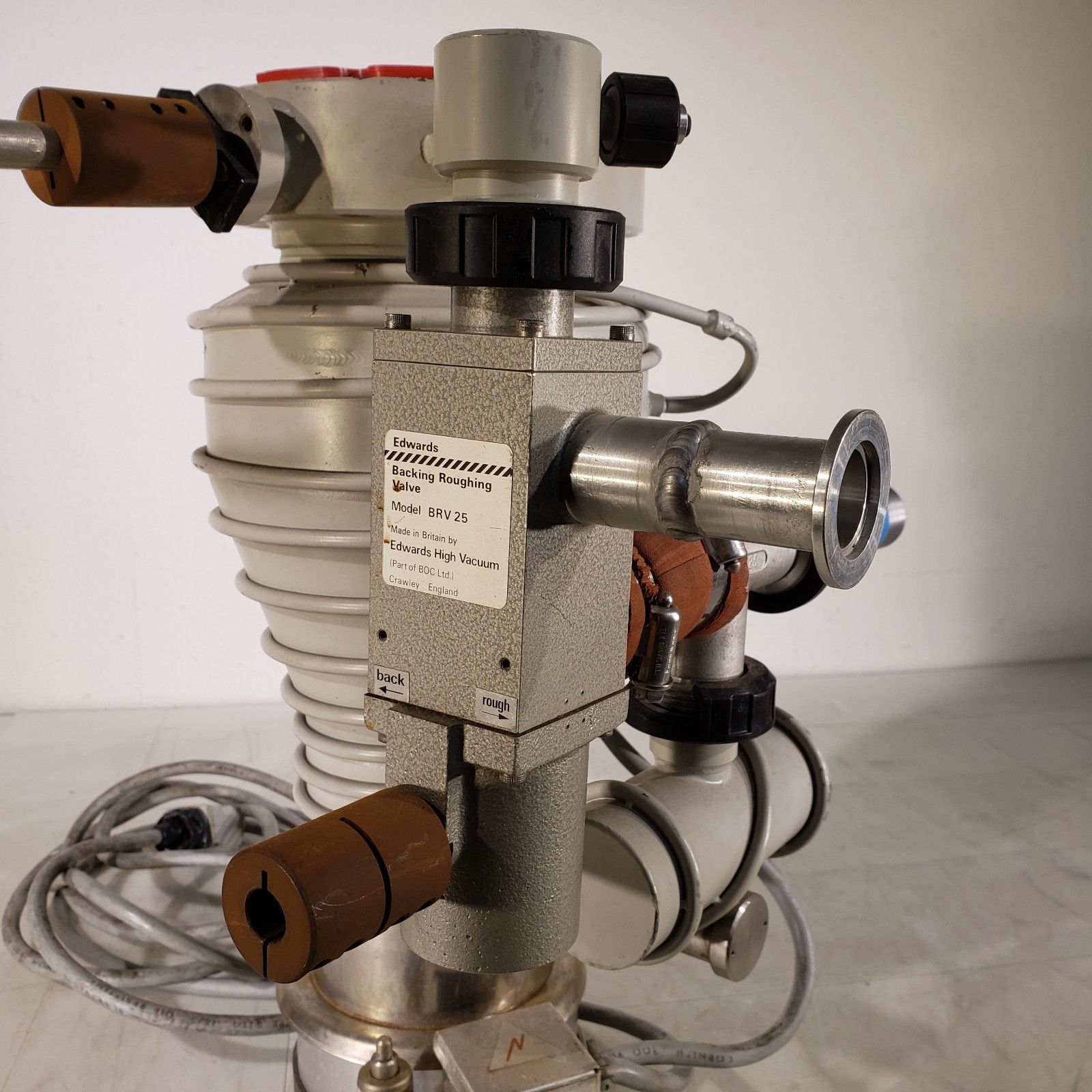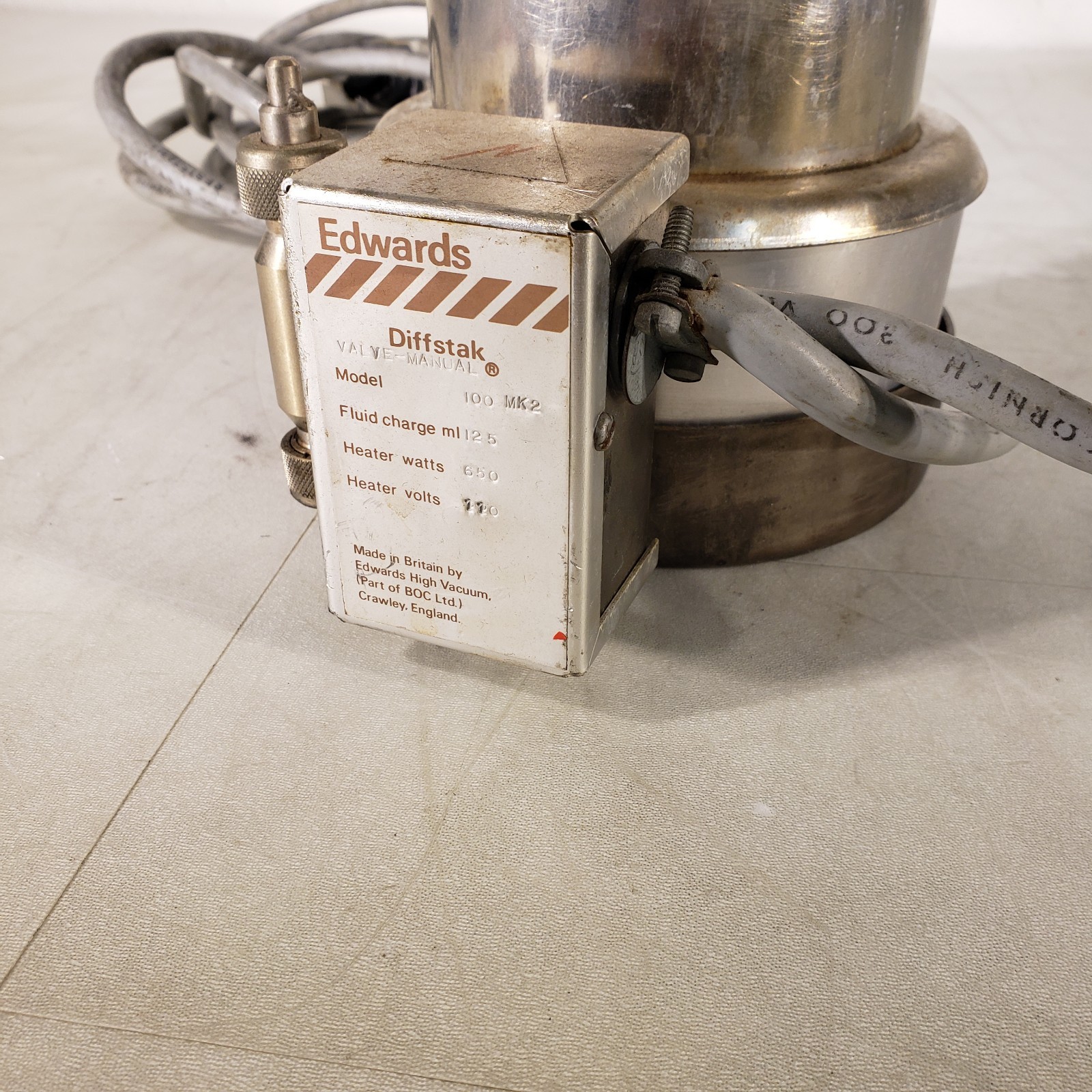 Edwards Diffstak 100MK2 Diffusion Pump Intake Flange ISO LFB100 6.5" Flange to Exhaust Flange KF25 NW25 Flange Ultra High Vacuum UHV Vacuum Pump Used, see photos. Diffstak 100 Mark II US 120V grounded plug approximately 12 feet long. Assembly includes Granville-Phillips 260069 Thermo-Gauge, and Edwards Backing Roughing Valve BRV25. ZV