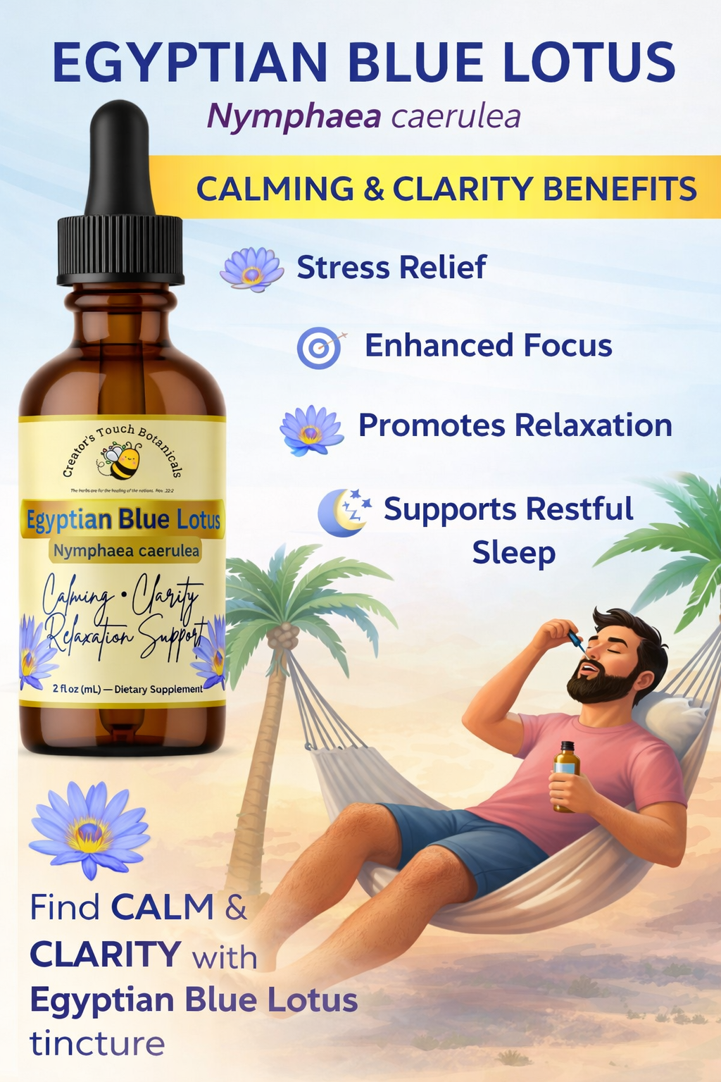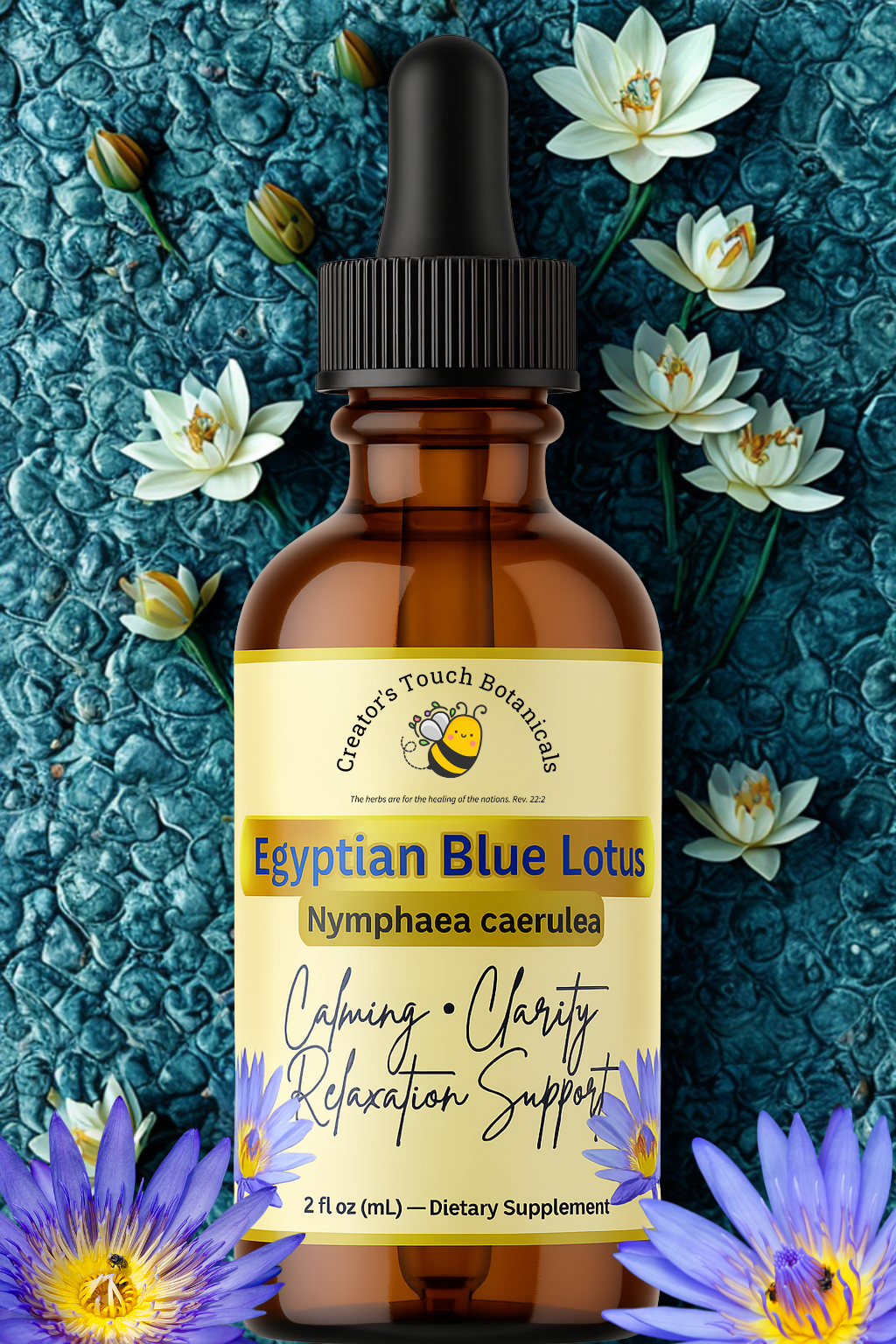 Egyptian Blue Lotus Tincture | 2oz Glycerite Extract | Nymphaea Caerulea | Relaxation & Mood Support Egyptian Blue Lotus Extract – 2oz Tincture or Glycerite | Nymphaea caerulea Discover the serene power of Egyptian Blue Lotus ( Nymphaea caerulea ), a treasured botanical traditionally used to promote calm, clarity, and deep relaxation. Our premium extract is available in two options to suit your lifestyle and preference: 💧 Choose Your Formula: Alcohol-Based Tincture – Made with pure grain alcohol for maximum potency and fast absorption. Alcohol-Free Glycerite – A gentle, sweet alternative ideal for sensitive individuals or daily use. 🌿 Key Benefits: Supports a calm and balanced mood Encourages relaxation and stress relief May support restful sleep and mental clarity Traditionally used for emotional wellness and focus 🧪 Supplement Facts: Extract Ratio : 1:3 (500mg herb equivalent per 1mL) Serving Size : 1 mL (approx. 30 drops) Servings per Bottle : ~60 Ingredients by Version: Alcohol-Based : Blue Lotus extract, Grain Alcohol, Distilled Water Glycerite : Blue Lotus extract, USP Grade Vegetable Glycerin, Distilled Water 📦 Product Details: Size: 2 fl oz (60 mL) amber glass bottle Dropper included for easy dosing Made in the USA with wildcrafted ingredients Manufactured by Creator’s Touch Supplements, LLC – Peoria, IL Enjoy the benefits of this ancient sacred flower in the format that suits you best. Whether you’re seeking a meditative moment or natural calm, Egyptian Blue Lotus is your herbal ally.
