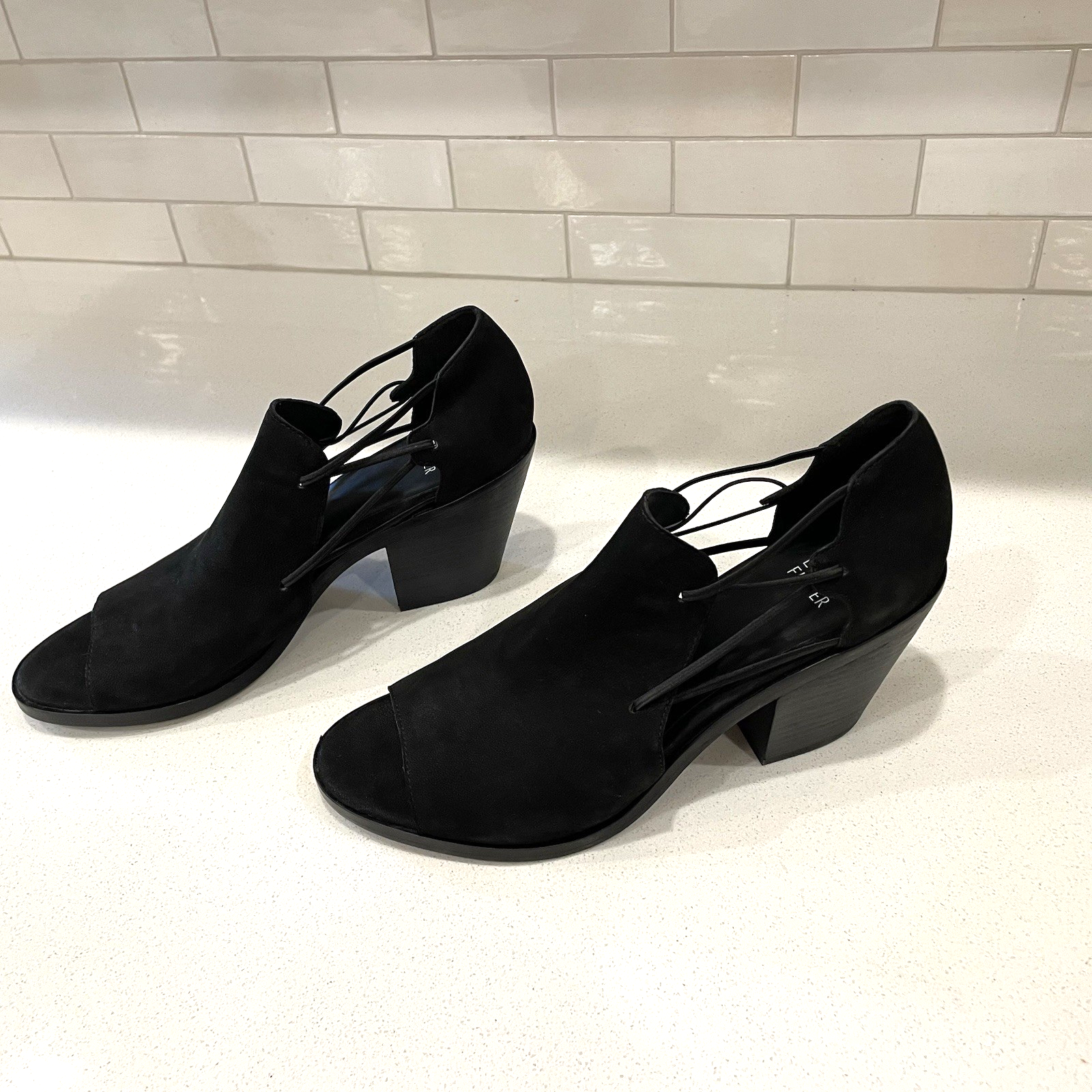 Brand new, without box pair of Eileen Fisher peep toe sandals. These are the "Nikki" peep toe sandals from Eileen Fisher. Side lace details and a sculptural block heel make this peep toe sandal a poised, modern essential. Open toe. Side cutout and lace detail. Stacked block heel. Approximately 2.75 inch heel. Leather and textile upper, leather and manmade sole. Size: 9 Color: Black Nubuck Full Retail Price $235
