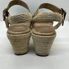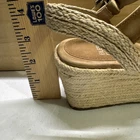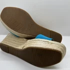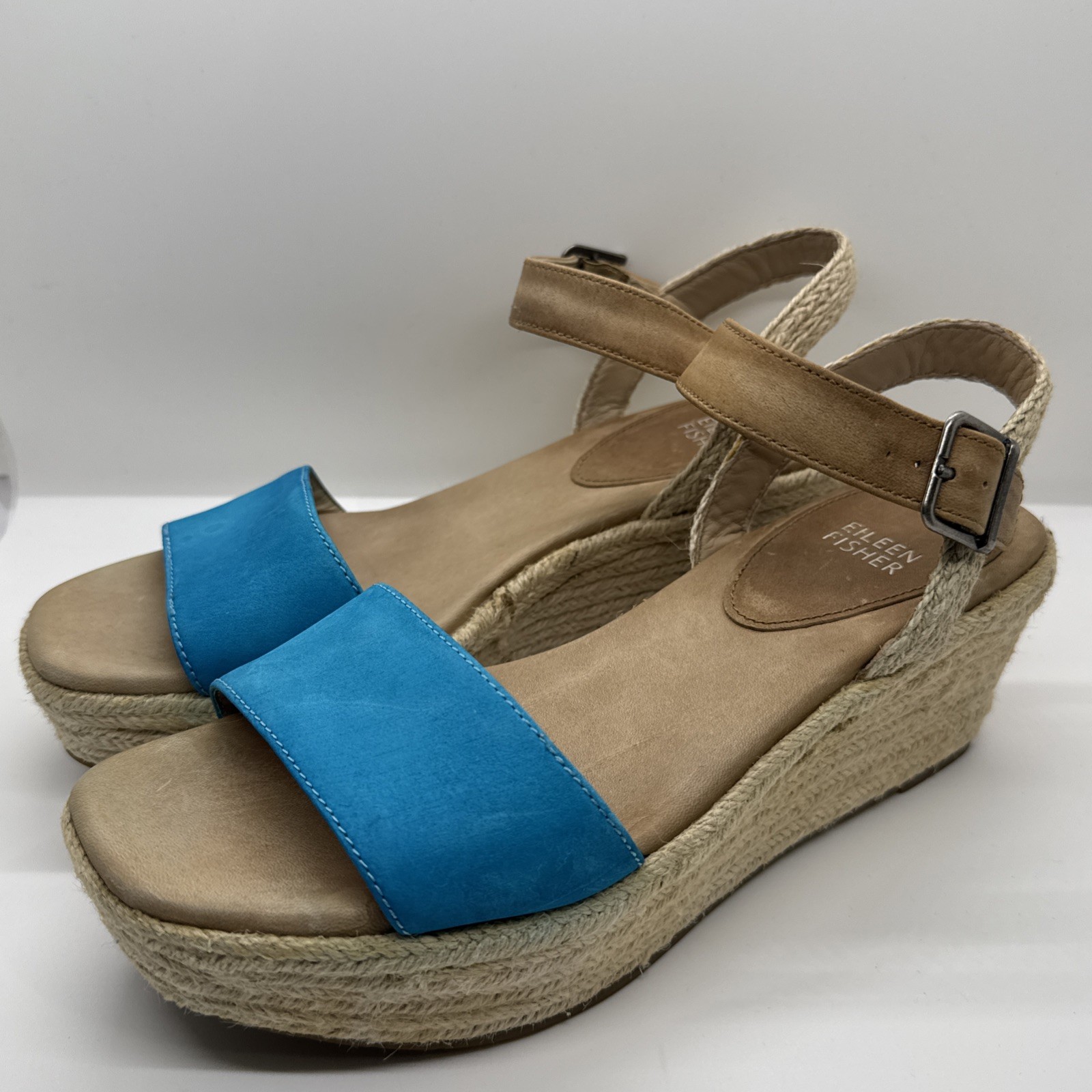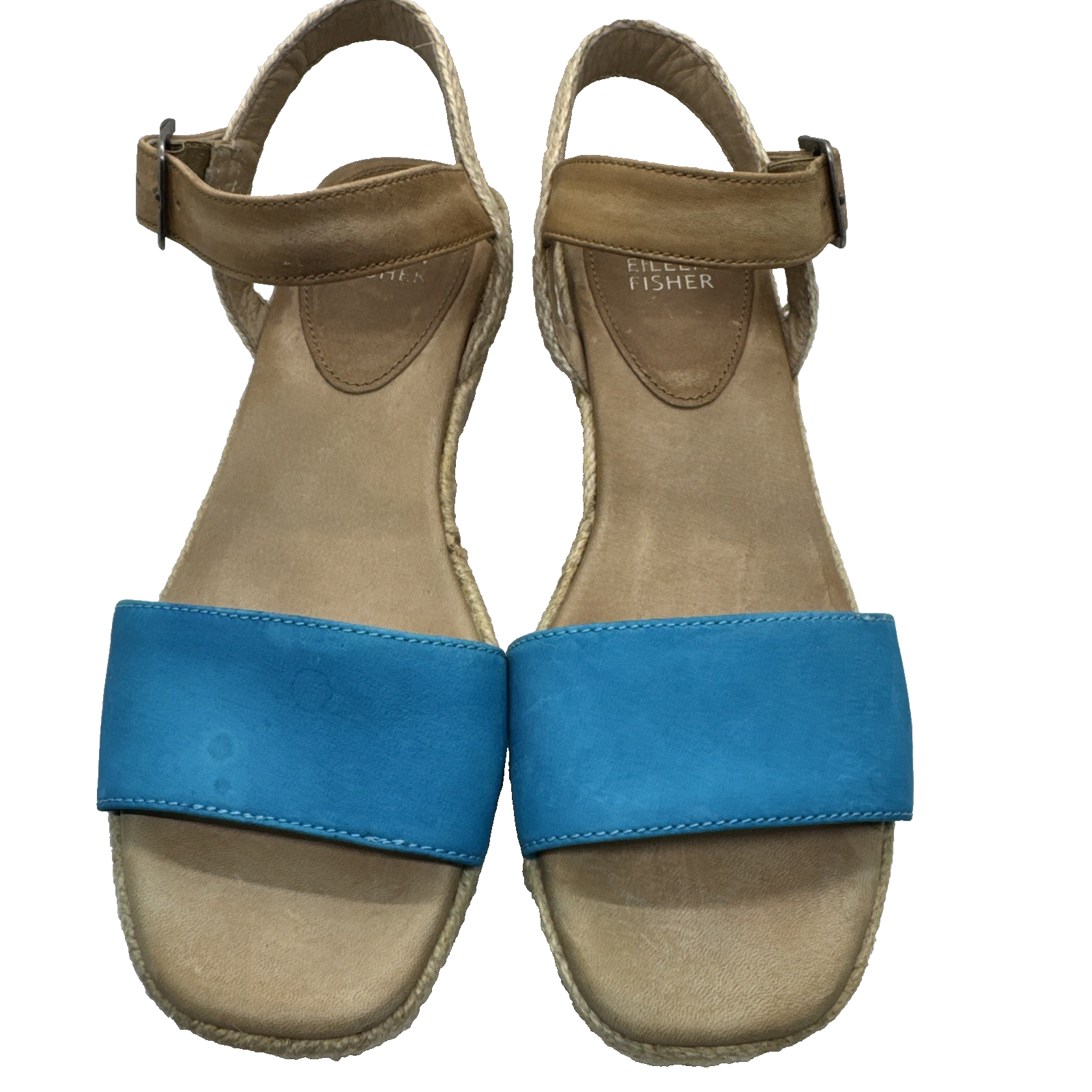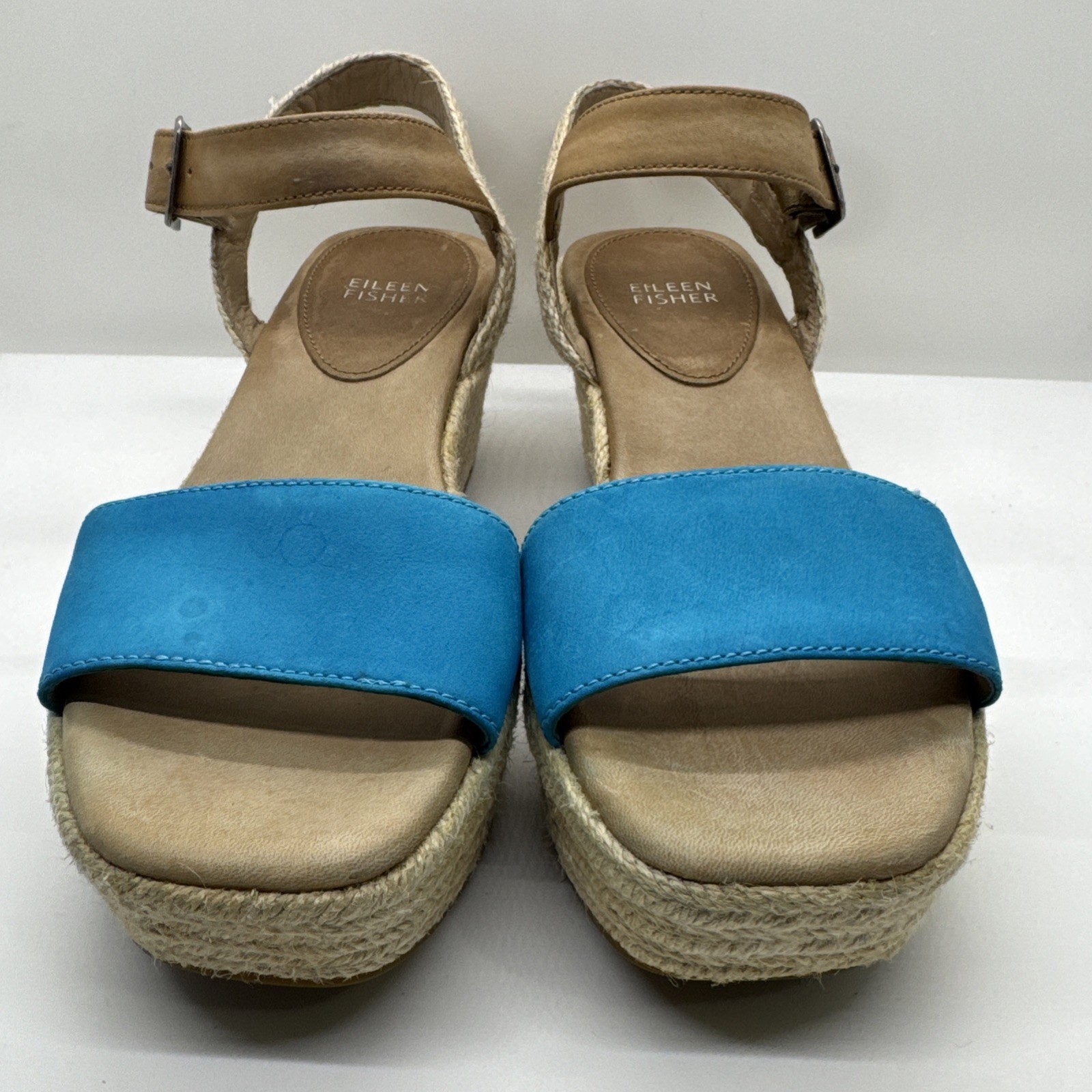 The Eileen Fisher Blue & Tan Espadrille Platform Wedge Sandals are a stylish and comfortable choice for women in US shoe size 7. These sandals feature a hook and loop closure, adjustable strap, and a low wedge heel for added support. Clean overall and ready to wear, please review all photos for details and condition, t he shoe has markings on the leather or rubber, caused by friction or typical wear. Smoke-free environment, fast shipping