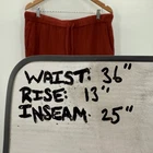 Relaxed and comfortable cropped pants, featuring a stylish blend of simplicity and subtle detail. These rust-colored pants are designed with a wide-leg silhouette that offers a breezy, modern look, complemented by a soft gauze texture that enhances its casual appeal. The design includes a comfortable drawstring waist, ensuring an adjustable fit, and a gently frayed hem that adds a touch of character, perfect for easygoing style. The pants also feature practical side pockets, seamlessly integrated for functionality without disrupting the clean lines of the garment. Measurements: • Waist: 36" • Rise: 13" • Inseam: 25" Style: Cropped Color: Red Department: Women Type: Pants Material: Cotton, Organic Cotton Leg Style: Wide-Leg Features: Drawstring, Pockets, Elastic Waist, Lightweight, Comfort Fabric Type: Gauze Closure: Drawstring, Pull On Pattern: Solid Accents: Fringe Occasion: Casual, Travel Inseam: 25 in Waist Size: 36 in Keywords: Eileen Fisher pants, organic cotton pants, gauze pants, cropped wide leg pants, rust colored pants, drawstring pants, casual pants, women's pants, boho pants, relaxed fit pants, comfortable pants, frayed hem pants, wide leg crop pants, summer pants