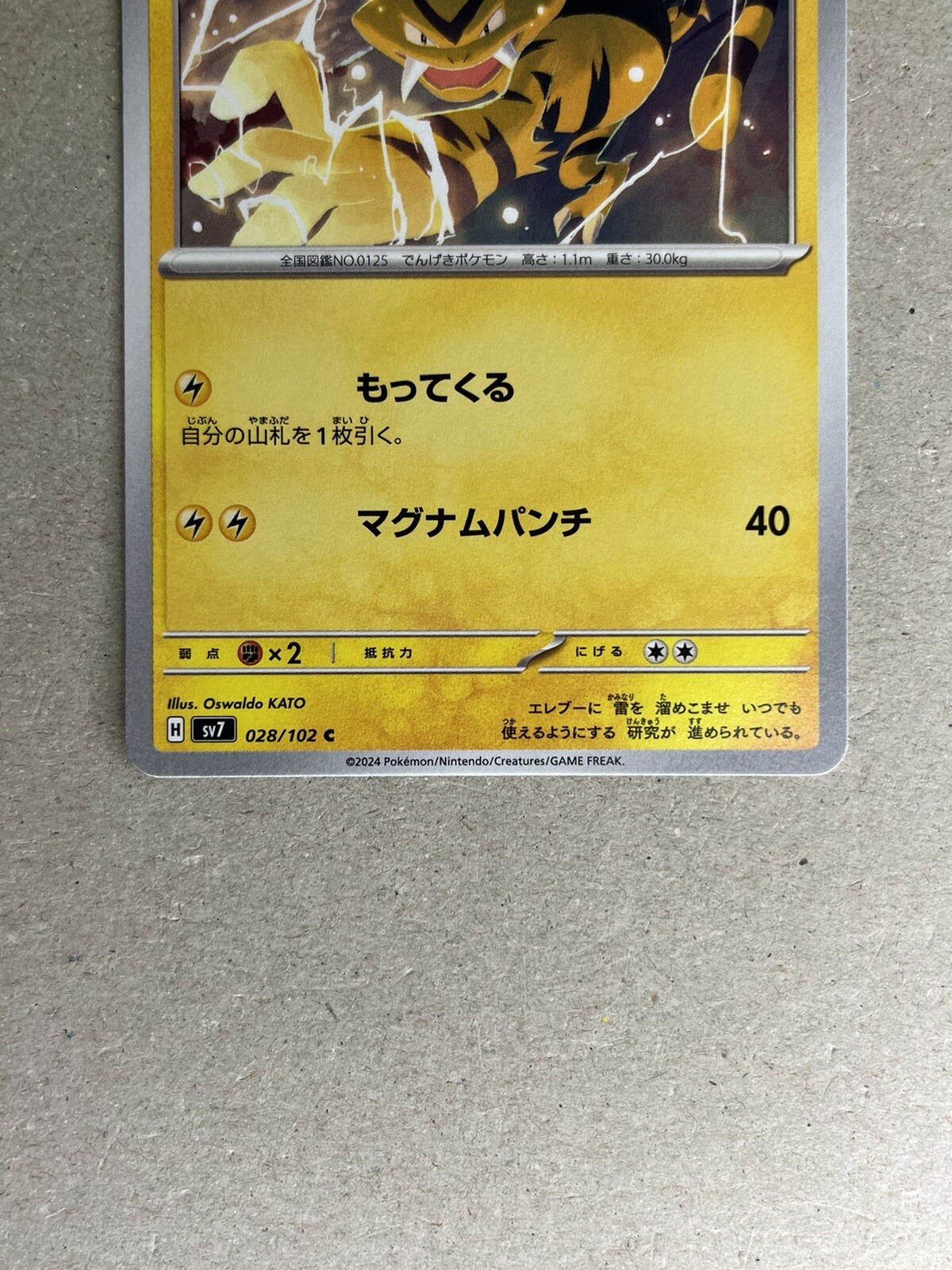 This rare and highly sought-after Electabuzz card is a must-have for any serious Pokemon TCG collector. With its stunning altered art and unique attributes, this card is sure to be a valuable addition to your collection. The card is from the Scarlet & Violet set and features the character Electabuzz, a Lightning-type Pokemon with an Abnormal Creature/Monster Type. The card is a Standard size and has a Regular finish, making it perfect for display or use in battles. It is manufactured by Nintendo in Japan and has a card number of 028/102. The card is in Japanese language and is suitable for ages 6+. Don't miss your chance to own this rare and exceptional card!