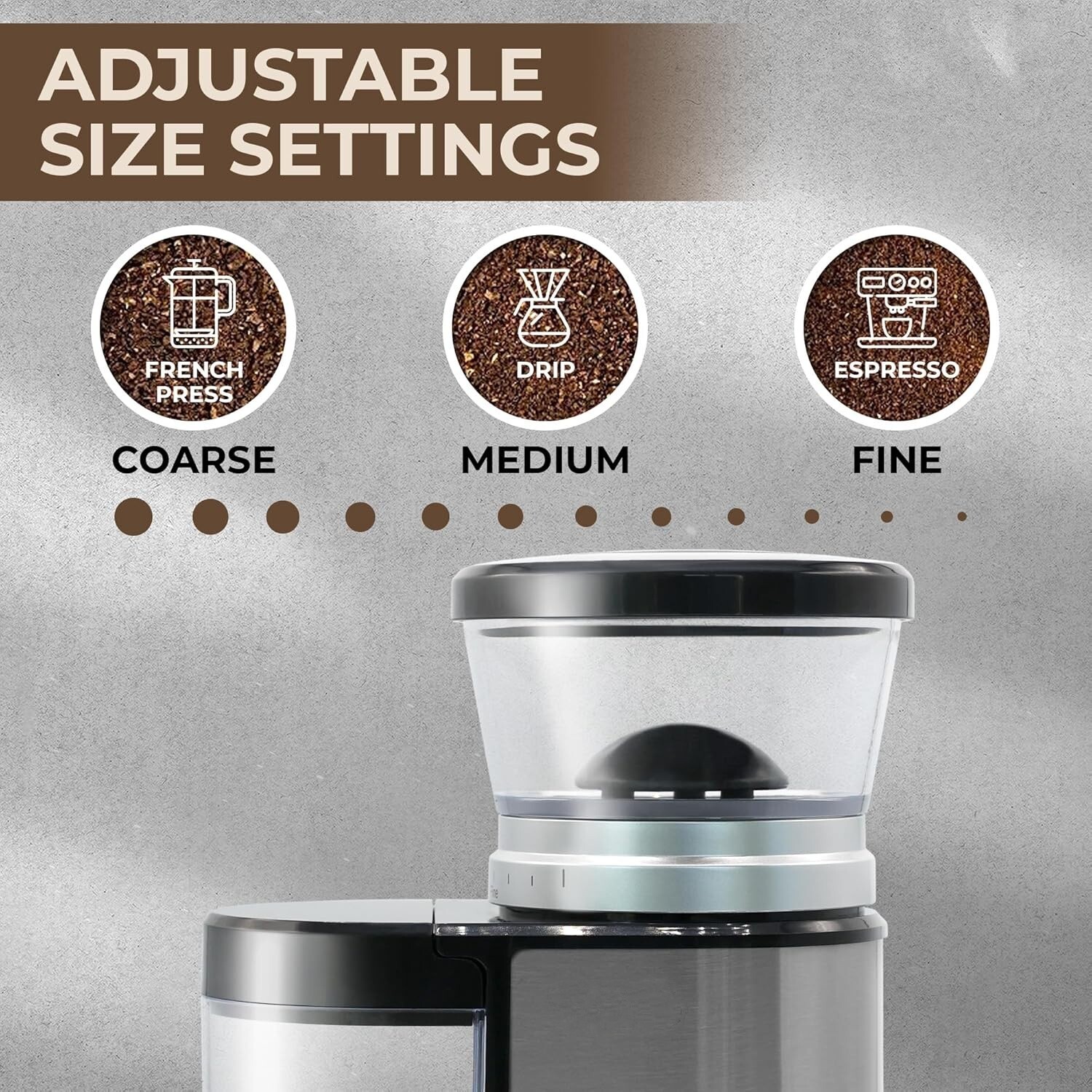 ☕️ CAFÉ FRESCO SIEMPRE - Garantiza la máxima frescura y un rico aroma moliendo los granos de café inmediatamente antes de su uso, liberando los aceites esenciales fragantes de los granos de café. Café profesional en la comodidad de tu propia casa. 🔝 MEJOR QUE LOS MOLINOS DE CUCHILLAS - Los molinillos de muelas planas producen una molienda más consistente que los modelos de cuchillas, lo que te permite ajustar la aspereza a tu método de preparación preferido. ¡Cepillo de limpieza incluido! ⚙️ AJUSTES DE GROSOR AJUSTABLE - Elige entre 14 configuraciones diferentes para qué tan fino o grueso moler los granos, desde prensa francesa-grueso hasta espresso-fino. 🌎 PARA TODOS LOS MÉTODOS DE PREPARACIÓN - Con solo girar la rueda de configuración, puedes lograr café en polvo grueso o fino para prensa francesa, café frío, vertido, moka, espresso o cafeteras de goteo.