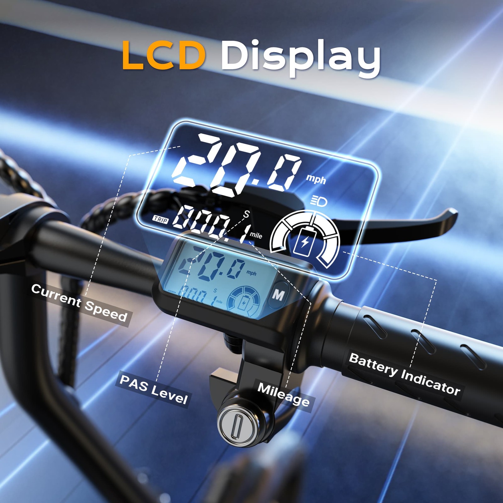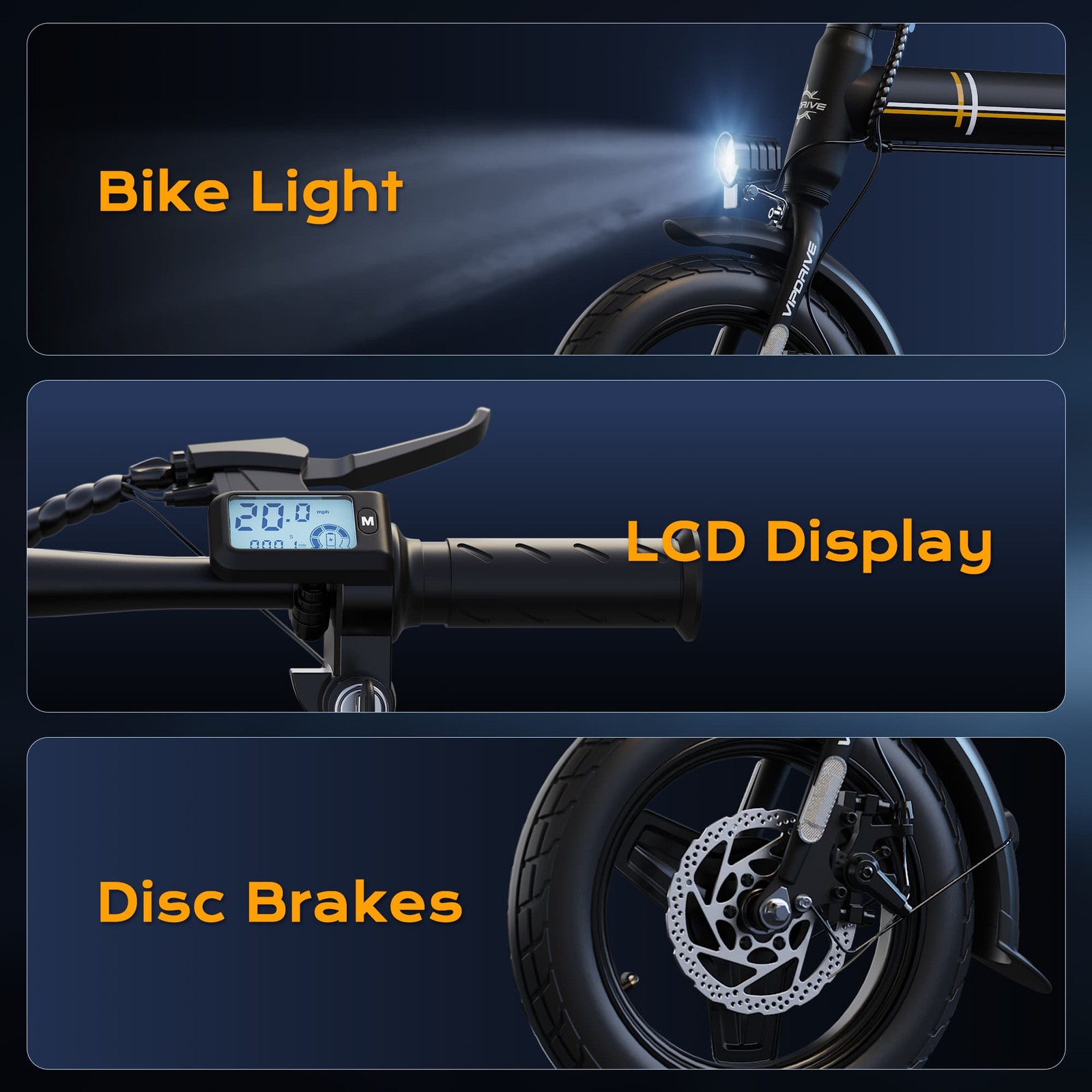【 Electric Bike】- 14" Foldable E-Bike for Adults & Teens, 500W Peak Motor, 36V 7.8Ah Battery, 20MPH Max Speed 🔋【Powerful 350W Motor & Long-Lasting Battery】 Equipped with a robust 350W brushed motor (500W peak), this e-bike delivers a max speed of 20MPH and climbs slopes up to 15°. The 36V 7.8Ah lithium battery supports 22–50 miles per charge and recharges in just 4–6 hours with built-in BMS protection for safety and battery longevity. 🚴【3 Riding Modes & Smart LCD Display】 Switch between Pure Electric, Pedal Assist, and Classic Bike modes to match your riding needs. The intuitive LCD display shows speed, battery level, and distance, while the twist throttle and key-secure start offer effortless control and anti-theft protection. ⚙️【Safe & Stable Riding Experience】 Features front and rear dual-disc brakes for reliable stopping power, a high-brightness headlight for night visibility, and a shock absorber for a smoother ride on urban roads. Suitable for riders between 4'3" to 5'6". 🛡️【Portable & Lightweight Design】 Weighing only 49.6 lbs with a quick-fold mechanism, this e-bike is easy to carry and store. Its compact 14" frame and 1.95" tires make it ideal for commuting, while the 220 lbs load capacity ensures durability for most riders. 💡【Ideal for Teens & Adults】 Designed for urban commuters and teens, the combines functionality, safety, and style. It’s a practical, eco-friendly transportation solution that promises fun and convenience every time you ride. Package include: 1*User Manual, 1*Charger, 1*Electric bike, 1*Tool Kit 1*Mobile phone stand 1*Car lock 1*Air pump Note: Our products have been certified under UL2849 safety standards. The item is UL 2849 certified with a link to the UL Product iQ