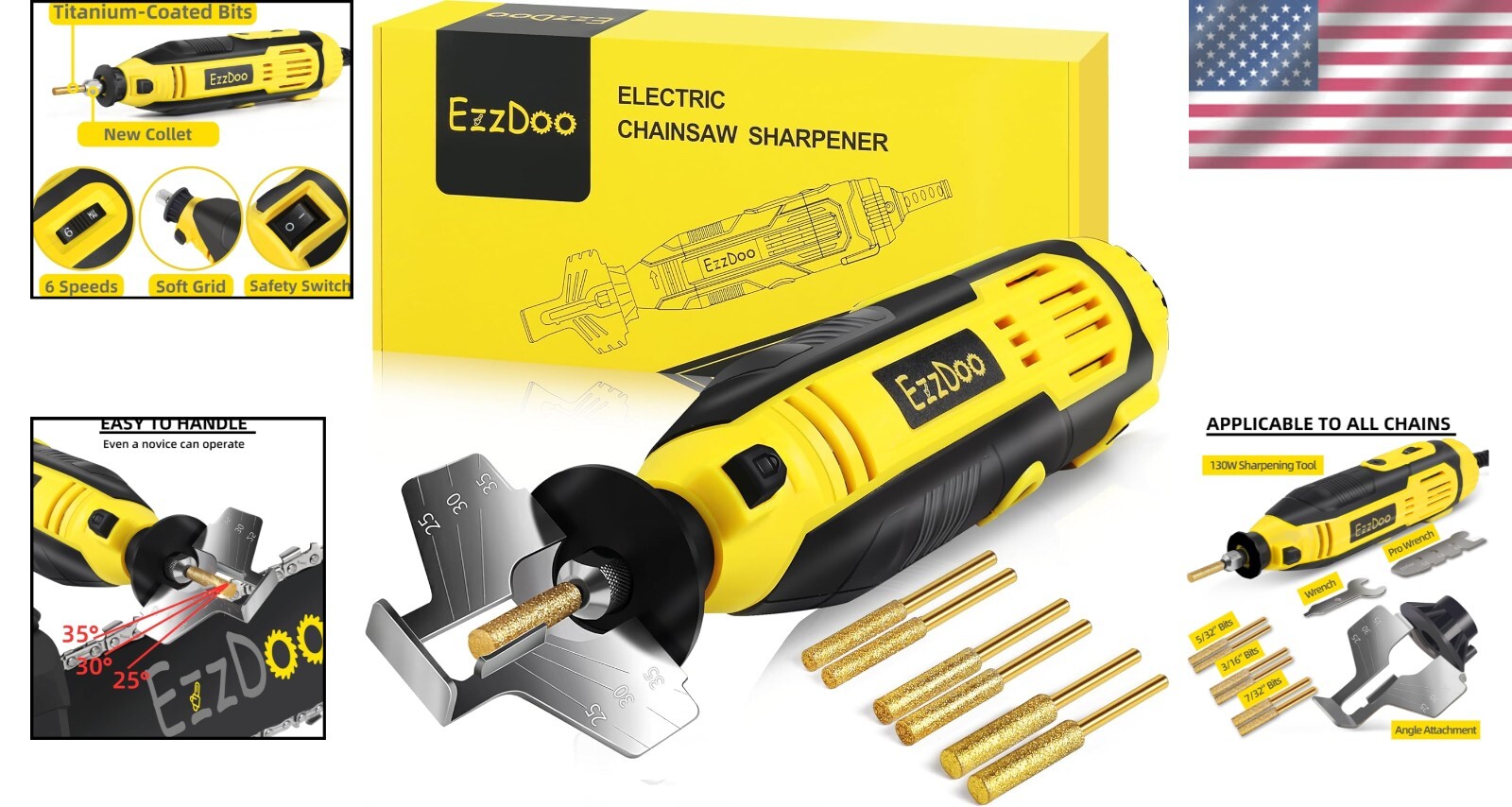 Electric Chainsaw Sharpener Kit with Titanium-Coated Bits & High-Speed Wheels ‹ › ‹ › ‹ › ‹ › ‹ › ‹ › ‹ › ‹ › ‹ › ‹ › Electric Chainsaw Sharpener Kit Includes Titanium-Coated Bits & High-Speed Wheels Features: Durable: The latest titanium-coated diamond wheels provide exceptional longevity, reducing the frequency of replacements. The kit comes with 6 pieces of wheels: 5/32'' ×2, 3/16'' ×2, and 7/32'' ×2, suitable for sharpening various chains. Easy to Use: Designed to simplify your sharpening tasks—no need to remove the chain or replace parts. With only 4 installation steps and an easy-to-follow video, you'll become proficient in no time. Fast Results: This high-power sharpening tool delivers rapid sharpening, even for the bluntest chains. Say goodbye to tedious hand sharpening—achieve professional results in just minutes. Precision: The included Angle Attachment ensures that you sharpen at the perfect angle and depth, making your chainsaw chain razor-sharp while protecting it from improper angle damage. Perfect Assistant: This efficient chainsaw sharpener not only restores your chain but enhances safety, making your work easier than ever. Beautifully packaged, it makes a thoughtful gift for fathers, husbands, and loggers alike. Why Choose Our Electric Chainsaw Sharpener Kit? If you’re looking for a sharpener that combines ease of use, durability, and professional-level results, this Electric Chainsaw Sharpener Kit is your ultimate solution. With its titanium-coating for long-lasting use and the ability to sharpen chains in just a matter of minutes, it transforms what was once a tedious task into a quick and efficient process. Embrace the ease and professionalism this tool offers—elevate your chainsaw maintenance game and experience the satisfaction of perfectly sharpened tools every time. Order now to redefine your sharpening experience and impress your fellow outdoor enthusiasts! Shipping Free & Fast Shipping - We offer free shipping to most of the USA with a normal delivery time of 3-7 days. However, due to the current situation, additional delivery time (up to 3 weeks) may be required for some items. Alternative Carriers - We may use alternative carriers (e.g. USPS, FedEx, UPS, etc.) to ensure your package arrives safely and on time. Due to the use of multiple carriers, we are unable to provide a tracking number automatically. Handling Time - Orders are processed and shipped within 1-2 business days of receiving cleared payment. Shipping Restrictions - Shipping to Alaska, Hawaii, Puerto Rico, Guam, and other US territories may incur shipping charges or delivery restrictions. Please contact us before ordering, or your order can be refunded/cancelled. State Restrictions - There may be restrictions based on your state of purchase. For example, certain items may not be shipped to California due to state regulations. Contact for Tracking Updates - If you require tracking updates or have any concerns about the delivery of your order, please feel free to contact us, and we will be happy to assist you. Return 30-Day Hassle-Free Returns - We want you to be completely satisfied with your purchase. If you are not, you can return the item within 30 days of receiving it for a full refund or exchange. Easy Return Process - To start a return, simply contact us and we will provide you with a prepaid return shipping label and detailed instructions. Restocking Fee - There are no restocking fees for returns. However, the buyer is responsible for return shipping costs if the return is not due to a seller's error. Refund Processing Time - Refunds will be processed within 5 business days of receiving the returned item in its condition. Payment We accept all major credit cards, PayPal, and Apple Pay for your convenience. Your payment information is secure and encrypted to ensure a safe and seamless transaction. Please complete your payment within 3 days of purchase to avoid any delays in shipping. Feedback Your feedback is extremely important to us. We strive to provide the best products and customer service possible. If you are satisfied with your purchase, please take a moment to leave us a positive review. If you have any concerns or issues with your order, please contact us before leaving negative feedback. We are committed to resolving any problems and ensuring your satisfaction. Contact Us If you have any questions or concerns, please feel free to out to our customer support team. You can contact us through the eBay messaging system. We are available Monday to Friday, 9:00 am to 5:00 pm EST, and we will do our best to respond to your inquiry within 24 hours. Buy it now and enjoy a pleasant shopping experience! Unit Quantity: 1 Compatible Product: Chainsaw Material: High Carbon Steel,Titanium-coated,Diamond Type: Sharpener Number in Pack: 1 Power Source: Electric Color: Yellow Item Weight: 1.4 pounds Unit Type: lb