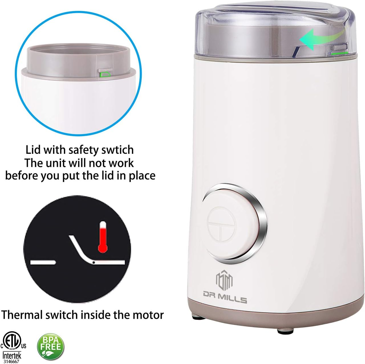 DM-7441 Electric Coffee Grinder White SUS304 Blade One-Touch Spice Mill Grinder Efficient and Easy:Electric Coffee Grinder with Power 150W,120V,60Hz Durable stainless steel blades grind coffee beans and spices with ease. Achieve your desired coarseness or fineness by Hold the button for working. Can see the grinding effect from the top of the lid. Easy to Clean: The included brush makes it easy to sweep away powder. Grinding cup grinds 1.8 oz./50g of coffee beans and makes 7 cups of coffee. Multiple Use:Crafted with durable stainless-steel blades, this spice grinder accommodates a variety of grinding dry ingredients from needs, coffee beans to nuts, Seeds, and dried spices. User-friendly Design:The Blade Grinder base has a non-slip design to stabilize the body and assist in grinding ingredients evenly. The power cord can be stored under the base to save space and keep it clean and tidy. Overheat Protection: coffee grinder with the thermal switch,with overheating protection. It is recommended that the grinding time be less than 30s in one cycle. Can work again after about 30min rest if it stop by abnormal use. Product Description How to use Put the coffee beans into the cup, Rotate transparent cover in place, Hold the button for working Size of the unit This is small home use appliance. Can use it in office. Lid with viewing window Can see the grinding effect from the top of the lid. Multiple use It can grind many kind of food such as coffee beans, almond, cinnamon, nuts, paprika, etc. Fine or Coarse as You Like Can get different size of the powder by operate different time. Stainless steel Blade Stainless steel blade of good quality, powerful and good performance. stainless steel SUS304 cup, with 1.8oz /50g. There is safety switch on the top of the unit, it will not work before you put the lid in place. Clean the grinding cup with a brush (or wipe with damp cloth). Thermal switch inside the motor,Can work again after about 30min rest if it stop by abnormal use. Put the coffee beans into the cup Rotate transparent cover in place How to clean thermal switch Item model number 7441 variants Style coffee grinder Product Dimensions 4"L x 3.9"W x 6.97"H Color White Country of Origin China Material Stainless Steel Item Weight 0.72 Kilograms Item Weight 1.58 pounds Voltage 120 Volts Recommended Uses For Product Grinding Wattage 150 watts Capacity 1.8 ounces Specific Uses For Product Grinding Size 4.0*3.9*6.97 Shipping Fast shipping is very important for us. Our standard US shipping service is FREE. Your order will be shipped within 2-3 business days upon full payment received. Your order will be delivered within 2-3 business days after the handling time. We only ship to the confirmed PayPal address. We reserve the right to cancel any order for any reason at any time. We are not responsible for undeliverable addresses. Returns and payment We offer a 30 days return policy from checkout winning date. We allow only PayPal as payment method FeedBack Your feedback very important to us, after you get your package and you are satisfied with our service please leave us positive feedback If you have any problem with your order / any questions please before leave any type of feedback For any questions, using eBay contact system Please visit our eBay store to check out other items for sale! Thank you for shopping at our store.