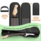 Lightweight Portable Gig Bag for Electric Guitars: Bag dimension 40.9 x 15.5 x 2.7 in, upper bout 11.8”, lower bout 14.7”, fits for 40 in Electric Guitars. NOTE: THIS GIG BAG IS TOO SHORT FOR AN ELECTRIC BASS GUITAR. Please select from electric bass guitar bags in our store if you need. 0.3in Padding Throughout: This black padded electric guitar bag focus on basic storage and carrying need, defending your gear against in-home accidents as well as light-travel nicks, scuffs and scratches, also the strong zipper and rubber shockproof base protect the guitar well. Guitar Neck Strap: Neck fixing strap secures guitar in place, reinforced interior cloth at headstock resist daily wear and makes this bag last longer. Large Front Pocket: Hold A4 and US letter size music sheets books, tablet, smartphone as well as small stuff such as tuners, strings, cables, picks, guitar straps. Dual Adjustable Backpack Straps + 2 Convenient Grip Handles: Provide multiple ways of carrying. Back hanger loop can be hung on the wall for decoration when not in use.