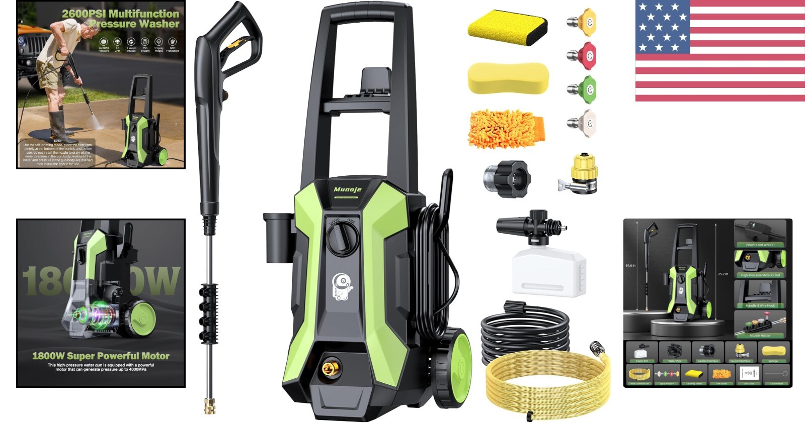 Electric Pressure Washer 2600 PSI with 5 Nozzles & 16.5FT Cord, Easy to Use ‹ › ‹ › ‹ › ‹ › ‹ › ‹ › ‹ › ‹ › ‹ › ‹ › Electric Pressure Washer 2600 PSI This efficient electric pressure washer is designed for optimal cleaning performance, making it your new go-to for tackling dirt and grime on various outdoor surfaces. Features: High Power: With an 1800W motor delivering up to 2600 PSI and a water flow rate of 2.0 GPM, this pressure washer effortlessly removes stubborn dirt from decks, driveways, and vehicles. Versatile Cleaning: Includes 5 quick-connect nozzles (0°, 15°, 25°, 40°, and soap) allowing you to easily switch pressure levels for different cleaning tasks. Car Wash Kit: The integrated foam cannon creates rich bubbles for effective car washing, while the included towels, gloves, and sponges enhance your cleaning efficiency. Mobility and : Enjoy extended with a 23 FT pressure hose and a 16.5 FT power cord, plus two water intake methods for ultimate convenience. Safety Features: Equipped with a Total Stop System (TSS) for automatic shut-off and a built-in GFCI for anti-leakage protection, ensuring a safer cleaning experience. Easy Transport and Storage: Designed with a retractable trolley bar and wheels for mobility, plus side compartments for convenient spray gun storage. Benefits: Effortlessly cleans multiple surfaces with high efficiency. Flexible cleaning options tailored to your specific needs. Safe and convenient to use in various outdoor settings. Hassle-free transport and organization ensure your cleaning sessions are efficient. Why Choose Our Electric Pressure Washer? Step into the future of cleaning with our Electric Pressure Washer 2600 PSI. Designed for both novices and seasoned professionals, this washer combines power with user-friendly features for a cleaning experience that transforms your outdoor spaces effortlessly. Cut through grime, breathe new life into your vehicles, and feel confident knowing you are equipped with a safe, reliable tool. Elevate your cleaning regimen today – don’t miss the opportunity to own the best in electric pressure washing! Shipping Free & Fast Shipping - We offer free shipping to most of the USA with a normal delivery time of 3-7 days. However, due to the current situation, additional delivery time (up to 3 weeks) may be required for some items. Alternative Carriers - We may use alternative carriers (e.g. USPS, FedEx, UPS, etc.) to ensure your package arrives safely and on time. Due to the use of multiple carriers, we are unable to provide a tracking number automatically. Handling Time - Orders are processed and shipped within 1-2 business days of receiving cleared payment. Shipping Restrictions - Shipping to Alaska, Hawaii, Puerto Rico, Guam, and other US territories may incur shipping charges or delivery restrictions. Please contact us before ordering, or your order can be refunded/cancelled. State Restrictions - There may be restrictions based on your state of purchase. For example, certain items may not be shipped to California due to state regulations. Contact for Tracking Updates - If you require tracking updates or have any concerns about the delivery of your order, please feel free to contact us, and we will be happy to assist you. Return 30-Day Hassle-Free Returns - We want you to be completely satisfied with your purchase. If you are not, you can return the item within 30 days of receiving it for a full refund or exchange. Easy Return Process - To start a return, simply contact us and we will provide you with a prepaid return shipping label and detailed instructions. Restocking Fee - There are no restocking fees for returns. However, the buyer is responsible for return shipping costs if the return is not due to a seller's error. Refund Processing Time - Refunds will be processed within 5 business days of receiving the returned item in its condition. Payment We accept all major credit cards, PayPal, and Apple Pay for your convenience. Your payment information is secure and encrypted to ensure a safe and seamless transaction. Please complete your payment within 3 days of purchase to avoid any delays in shipping. Feedback Your feedback is extremely important to us. We strive to provide the best products and customer service possible. If you are satisfied with your purchase, please take a moment to leave us a positive review. If you have any concerns or issues with your order, please contact us before leaving negative feedback. We are committed to resolving any problems and ensuring your satisfaction. Contact Us If you have any questions or concerns, please feel free to out to our customer support team. You can contact us through the eBay messaging system. We are available Monday to Friday, 9:00 am to 5:00 pm EST, and we will do our best to respond to your inquiry within 24 hours. Buy it now and enjoy a pleasant shopping experience! Unit Quantity: 6.9 lb Features: Cordless,Pressure Washer,GFCI Indicator Light,Quick-Connect Nozzles,Foam Cannon,Safety Lock,Self-Priming,Retractable Trolley Bar,Storage Compartments,Cable Hook Items Included: Hose,User Manual,Water Pressure Washer,Nozzles,Soap Pot,Water Inlet Pipe,High-Pressure Pipe,Car Wash Kit,Garden Interface,Faucet Interface,Cleaning Needle Material: Plastic Type: Electric Pressure Washer Power Source: Corded Electric Maximum Pressure: 2600 psi Voltage: 110 V Power: 1800 W Soap Tank Capacity: 1 gal Color: Green Item Height: 1 Inches Item Weight: 6.9 lb Unit Type: lb