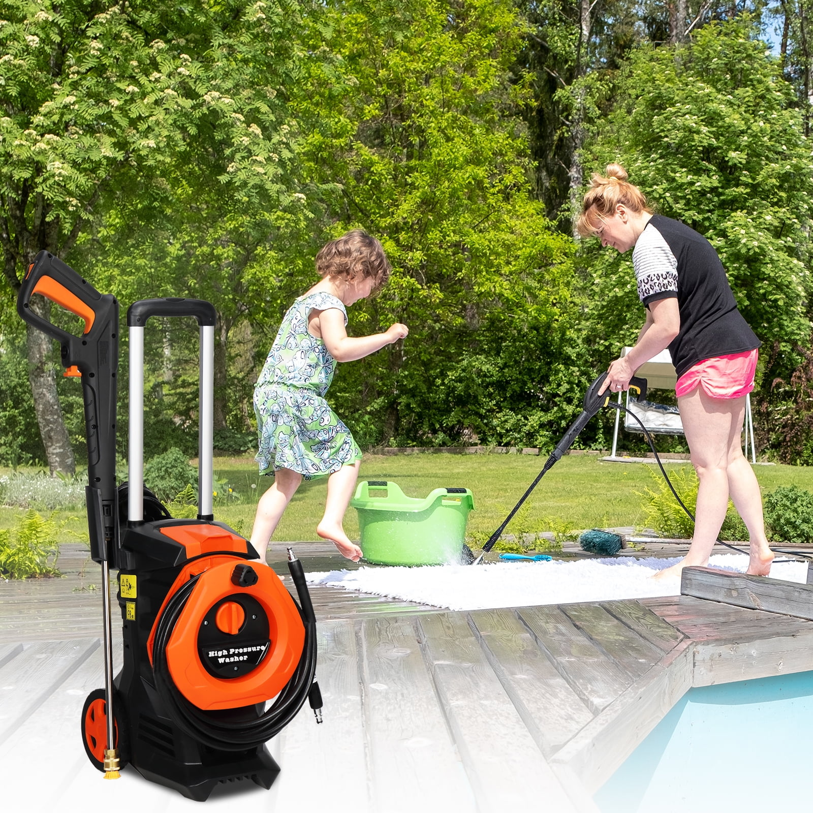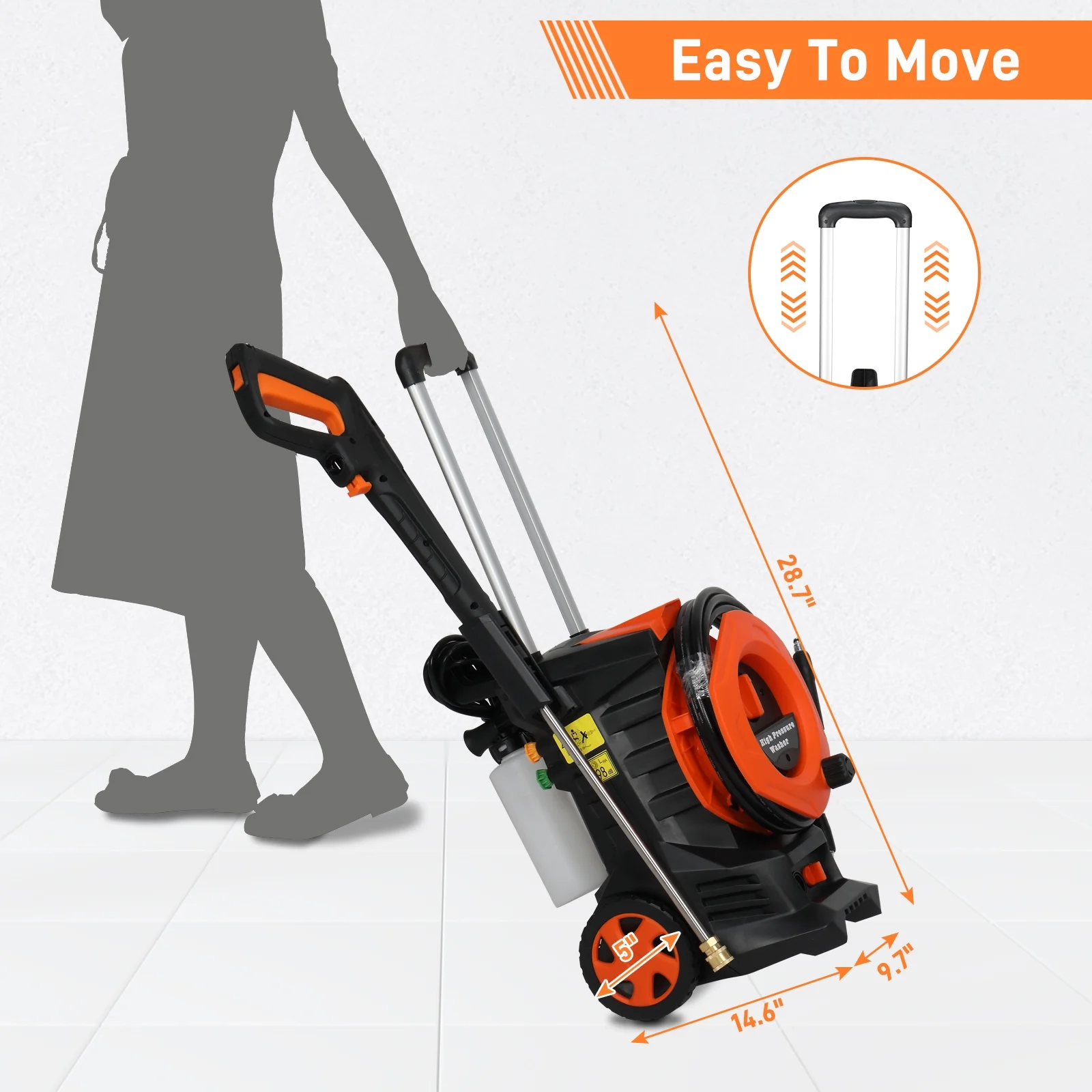Tired of stubborn dirt on your driveway, car, or patio? The Electric Pressure Washer delivers 3380 PSI of deep-cleaning power with its 1800W motor, making tough grime disappear effortlessly. Ideal for driveways, decks, cars, and outdoor furniture, this Portable Power Washer eliminates back-breaking scrubbing—just attach the 4 quick-connect nozzles (0°, 15°, 25°, 40°) and tackle any surface with precision. The Foam Cannon ensures a professional-level clean, coating vehicles or surfaces in rich detergent for a spotless finish. No more weak sprays or wasted effort—this washer gets the job done fast. Designed for convenience, the High-Pressure Washer features a telescopic handle, large wheels, and a 23.95ft hose for easy maneuvering and storage. The Safety Lock prevents accidental use, while the Total Stop System conserves energy by shutting off the pump when idle. Weighing only 16.53 lbs, it's compact yet powerful enough for cars, boats, RVs, fences, and more. Everything stores neatly on the unit—no more tangled hoses or cluttered garages. Specifications: 1. Material: Plastic and Metal 2. Dimensions: (9.65 x 14.57 x 28.74)inch / (24.5 x 37 x 73)cm (L x W x H) 3. Wheel Diameter: 12.5CM/ 5 inch 4. Power Cord Length: 16ft / 5m 5. Hose Length: 23.95ft / 7.3m 6. Wattage: 1800W 7. Max Pressure: 3380PSI 8. Flow Rate: 2 GPM 9. Features: Total Stop System 10. Applications: For Homes, Cars, Boats, RVs, Driveways, Decks, Patios, Gardens, Fences, Sidewalks, Walls, Yards 11. Weight: 16.53 lbs. Package Includes: 1 * High Pressure Washer 【Powerful 1800W Motor for Maximum Cleaning】 The Electric Pressure Washer features a robust 1800W motor, delivering up to 3380 PSI and 2 GPM for unmatched cleaning power. Ideal for removing stubborn stains from driveways, patios, and cars. No more struggling with weak cleaners – this washer gets the job done fast. 【Safety Lock & Total Stop System for Energy Efficiency】 Equipped with a Safety Lock to prevent accidental use and a Total Stop System that shuts off the pump when not in use, this Portable Power Washer saves energy and extends pump life. Perfect for families looking for a safe and efficient cleaning solution. 【Easy to Store and Move with Portable Design】 This High-Pressure Washer comes with a telescopic handle, large wheels, and a long high-pressure hose for easy movement and storage. After use, all accessories can be neatly stowed on the unit. No more clutter – keep your space organized and ready for the next cleaning session. 【4 Quick Connect Nozzles for Versatile Cleaning】 The Pressure Washer includes 4 interchangeable nozzles (0°, 15°, 25°, 40°) and a soap bottle for various cleaning tasks. Whether it's concrete, wood, or windows, you'll have the right nozzle for every job. No more switching tools – this washer does it all. 【Foam Cannon for Deep Cleaning】 The included Foam Cannon transforms your Electric Pressure Washer into a professional-grade cleaning machine. Perfect for applying soap and detergents to cars, driveways, and outdoor surfaces. You'll love how it makes cleaning faster and more effective.