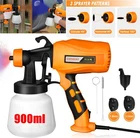 Descriptions: Advanced Technology & Careful Design:550W HVLP spray gun uses 900ml high capacity container to improve painting efficiency.The maximum viscosity has been upgraded and the spraying effect is also greatly improved, which can paint a smooth and superior finish. The output of the paint volume can be controlled by adjusting the flow control knob, which is suitable for different spray painted items and can spray where the roller can't reach. Upgraded Motor & High-Quality Materials:The motor uses a fuse with temperature protection. When a certain temperature is reached, the motor will automatically cut off the power supply to prolong the service life. Brass nozzles have superior performance than plastic nozzles, sturdy material, not easy to be clogged, and easy to clean. Double-layer insulation coat avoids any safety issues during operation. Dust Blowing Function & Easy to Clean:Before spraying,you can use the paint sprayer to blow away the dust/debris on the surface to get a better surface spraying effect. After painting, disassemble the motor part and soak and clean other accessories.It comes with a cleaning brush and a needle to unclog any hardened paint left in the nozzle part so that you can clean it easily and efficiently. Wide Range of Application Scenarios:550W paint sprayer equipped with 4 size nozzles for most painting projects,such as Fence,ceiling,walls,doors,garden tables and chairs etc .Can be adjusted to 3 different spray patterns:horizontal,vertical and circular,so that it can be applied to a wide range of application scenarios. Specification: Cable Length:1.7m Paint Spraying Volume:6.3(ml/s) Color:Orange Package List: 1x550W Paint Sprayer, 1x900ml Paint Container, 2xCopper Nozzles 1xFilter, 1xViscosity Cup, 1xCleaning Needle, 1xCleaning Brush 1xUser Manual