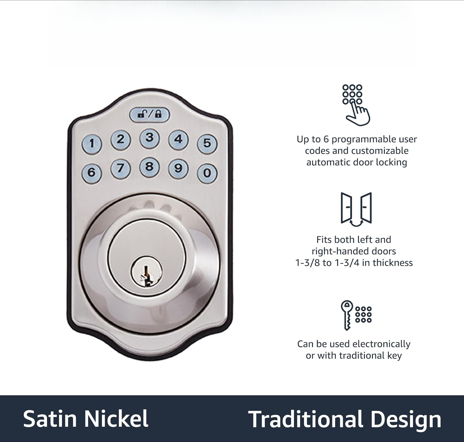 KEYLESS ENTRY CONVENIENCE: Experience the ease of touch-control with our keyless entry door lock. This electronic deadbolt door lock offers secure access, keeping your home protected CUSTOMIZABLE SECURITY CODES: Secure your home with a digital door lock that allows 6 user codes and temporary single-use codes for guests for controlled access whenever needed AUTOMATIC LOCKING FEATURE: Enjoy peace of mind with a keypad deadbolt lock featuring automatic locking that secures your door 10 to 99 seconds after entry VERSATILE DOOR COMPATIBILITY: This keypad door lock is designed to fit standard door preparations, accommodating door thicknesses of 1-3/8 to 1-3/4 inches DUAL OPERATION OPTIONS: Use the keypad deadbolt for easy access or a traditional key outside, complemented by a thumb turn lock inside for flexible and reliable security options