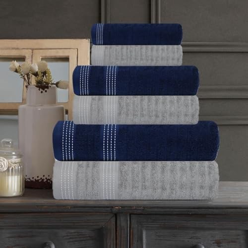 Return Policy Fast Delivery Trusted seller Elegance Collection Towels 550 GSM 2 Bath Towel 2 Hand Towel 2 Washcloths, Super Soft Egyptian Cotton 6 Towels Set for Bathroom, Kitchen & Shower - Navy Blue + Grey Product Description INGREDIENT: Set contains 2 Large Bath Towels of 27x54 Inches, 2 Large Hand Towels of 16x28 Inches, 2 Washcloths of 12x12 Inches. MATERIAL: Made of 100% cotton fabric and terry in nature provides excellent absorbency quality. TEXTURE: Our Towels are 550 GSM, made from natural materials which is safe for you and your family. Available in Six beautiful colours combinations to go with the décor of your home, spa, or gym. FUNCTION: Highly absorbent, yet light-weighted. Gives the body a soft, plush and fluffy feel while absorbing the moisture. CARE TIPS: The Towels are machine washable. Wash the towels in cold water before use. This will cause the cotton fibres to open up and give the towels better absorbency. Always wash towels separately from all other items of clothing to decrease transfer of towel lint to other clothing. Hang them up afterward in an area with good air or in direct sunlight. Shipping Returns Payment Shipping Shipping is FREE to all addresses other than APO/PO boxes in the lower 48 states. All our stock ships from US-based warehouses. Shipped via USPS or UPS (depending on location and package weight) Unless stated otherwise, all orders will ship within 24-72 hours of your payment being processed. Check our feedback to see the great reviews of FAST shipping we offer. Returns Seller does not accept returns Payment We currently accept payment via eBay managed payments only. Once payment is cleared, we will dispatch your shipment within 1-3 business days. Please refer to the "Shipping" tab for more information regarding shipping speed to your destination.