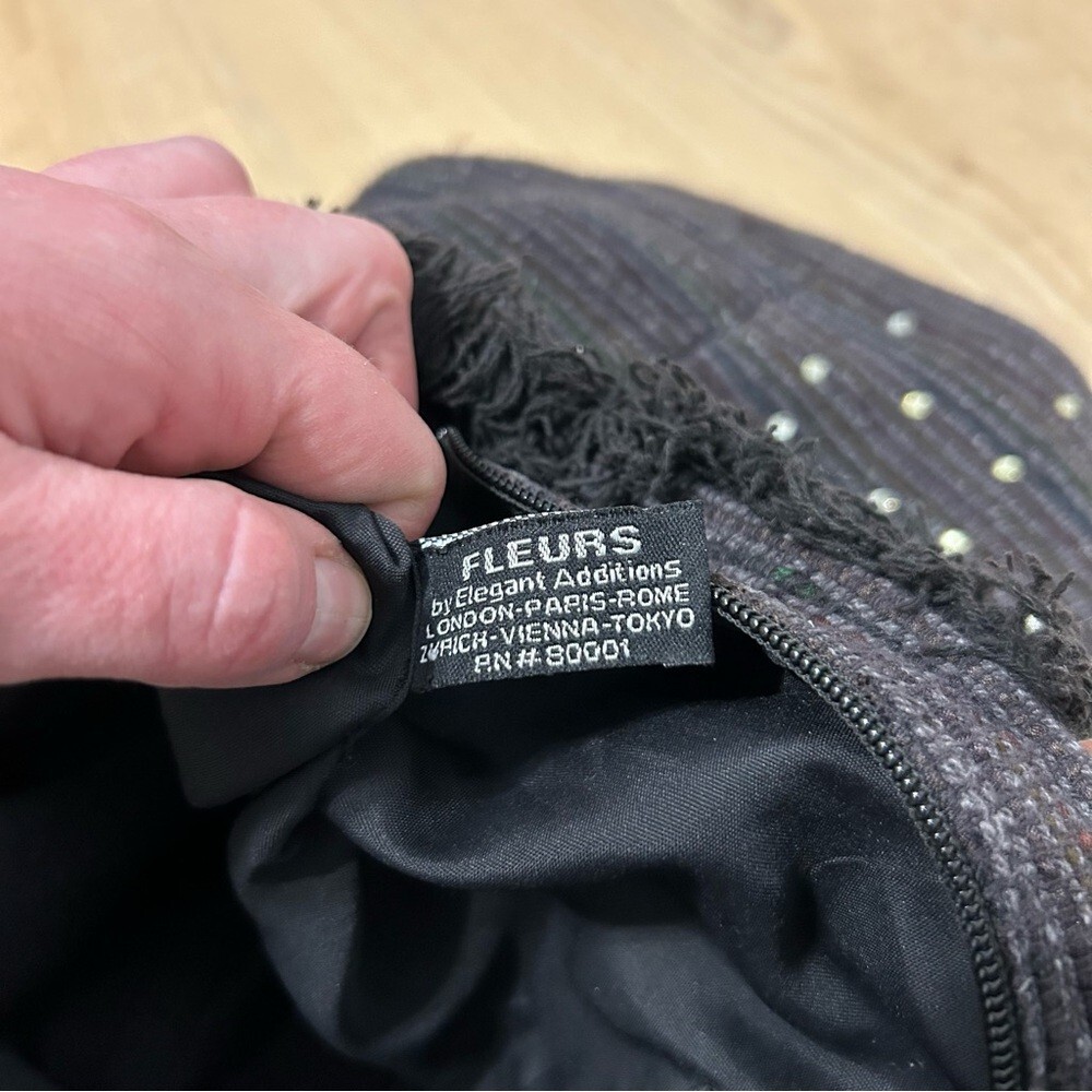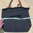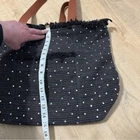 This stylish tote bag features a black fabric adorned with charming jewels, complemented by sturdy brown leather straps. Its medium size and unique trapezoidal shape make it perfect for daily errands or casual outings. The decorative frill along the top edge adds a touch of elegance to this practical accessory.
