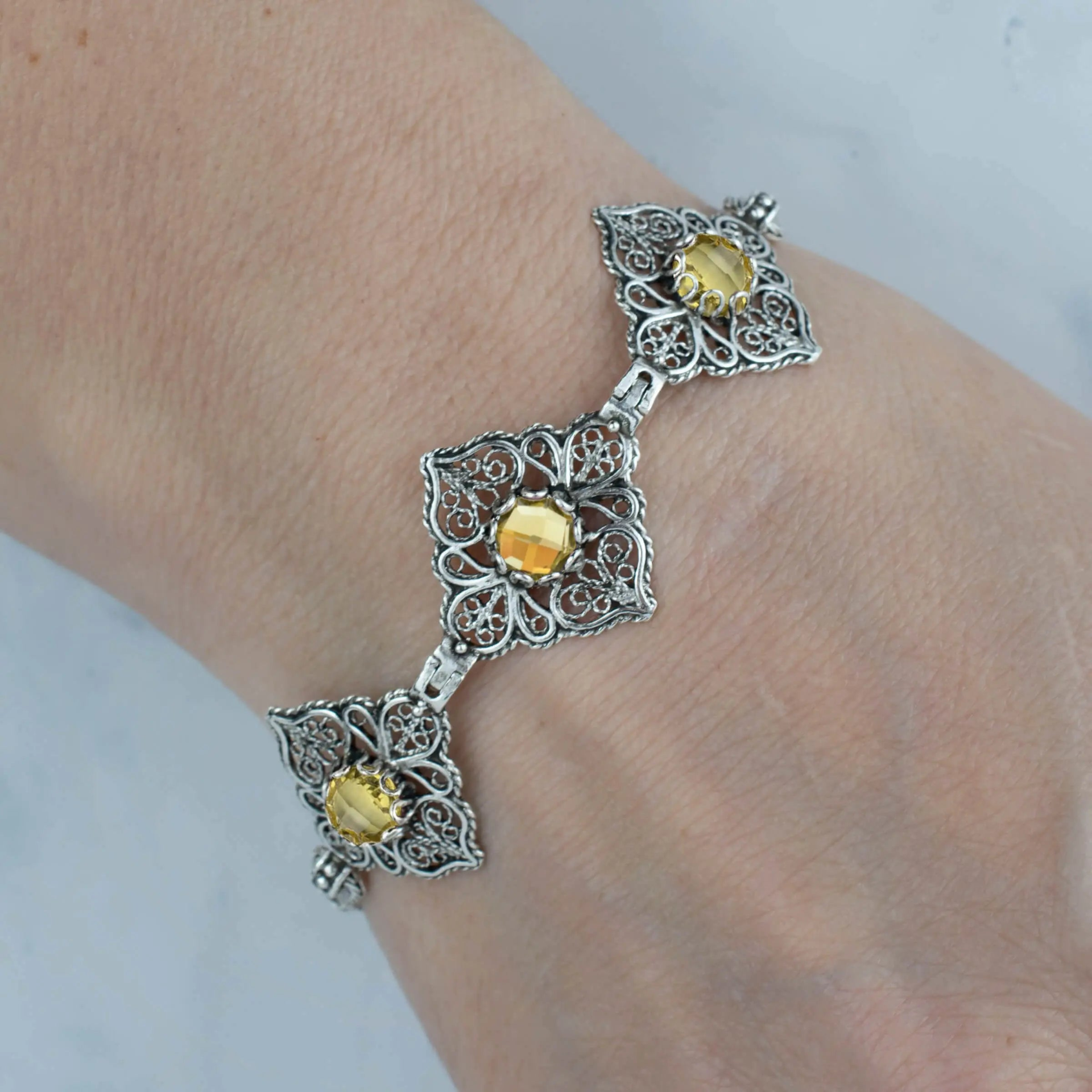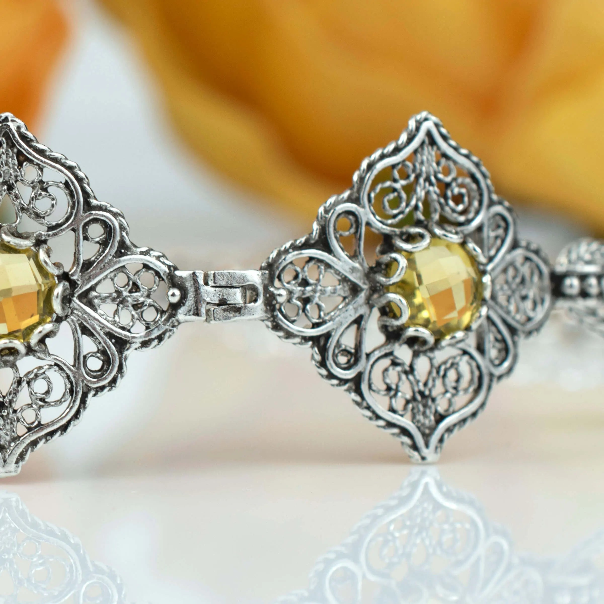 Make a statement with this 925 sterling silver handmade filigree art paisley design bracelet featuring stunning Citrine gemstones. The bracelet is adjustable with a length of 7.00 inches + 2.00 inches extension, ensuring a perfect fit for any wrist size. Each gemstone is 6.00 mm round cut, showcasing their brilliance and natural beauty. This beautiful bracelet is the perfect gift for special occasions such as anniversaries, birthdays, or Thanksgiving. Citrine is the November birthstone, making it an ideal gift for November babies or anyone who loves this beautiful gemstone. Crafted with high-quality materials and intricate filigree detailing, this bracelet is sure to impress. It comes with a silver polish cloth and a luxurious gift box, making it a complete gift package. Add this stunning bracelet to your collection or give it as a gift to someone special. Experience the beauty and elegance of 925 sterling silver and Citrine gemstones for yourself!