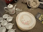 Beautiful set with a teapot, creamer cup, and 12 big plates, 12 teacup plates, 12 teacups, and 12 bowls. Sugar bowl, platter, salad bowl, and salt and pepper shaker. Brand new never used.