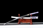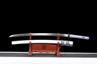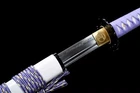 Product Parameter: Package: 1sword+1bag Number: TYQ451 HRC(Hardness): 60 Craft: Fully handforging,traditional water quenching and clay tempering,hand-polishing,etc. Blade: Clay tempered T10 high carbon steel Fittings: Alloy+purple silk Saya: lacquered shiny wood sheath Hamon: Real handmade hamon Overall: 103cm/40.6" Blade: 70cm/27.5'' Handle: 26 cm/10.24'' Widdth: 3.2 cm/1.26'' Thickness: 0.7cm/0.28'' Bo-hi(blood groove): can be removed for free Construction: Maru Nakago: Full tang (2 bamboo menuki vertically fixed handle,very firm) * It's a functinonal sword. After test, it can cut bamboo,A4 paper and water bottles,etc. * All the fittings can be replacement. Tsuba & Fuchi & Kashira & Habaki Saya Additional Service About us Delivery details Tsuba & Fuchi & Kashira & Habaki Alloy Tsuba Iron Tsuba ( extra $10) Brass Set ( extral $50 ) Alloy Fuchi & Kashira Habaki TSUKA-ITO & SAGEO Tsuka-ito is the wrapping of the tsuka and sageo (下緒 or 下げ緒) is a hanging cord that is passed through the hole in the kurigata (栗形) of a Japanese sword's saya. SAMEGAWA Samegawa(鮫皮)is the ray or shark skin wrapping of the tsuka (handle/hilt). Saya Please contact us before placing an order to see if there is any stock available, as well as any additional charges. OX Horn Saya Additional Service It's free for engraving English words, Chinese Characters and Japanese Kanji , etc. You need pay extral $20-30 for engraving patterns. Hamon We can add or remove the machine-made wavy hamon for free. Bo-hi ( Blood Groove) Usually thought be used for bloodletting only. It is also used to lighten the weight of the sword. We can add or remove Bo-hi for free Sharpness Most of our blades are sharp. We can also make the blade unsharpened for free if you require. Colored Blade If you want to change to a different color blade, please contact us before purchase. Matching Swords Set If you buy one katana, we can make a matching Wakizashi or Tanto for you. The price varies from different swords. Please contact us if you need make custom matching set. About us We have our own sword-casting factory. The factory is located in Longquan, a small town with a long history of sword-casting in China. Most of the famous Swords in China are made there. Rich raw materials, skilled technology, traditional sword casting technology from generation to generation. Manual production really takes a lot of time. We will prepare most products in advance ,and arrange delivery within about a week. However, sometimes the delivery time is delayed due to weather or raw materials,etc. we hope to get your understanding. Feel free to contact us to inquire about the status of your order. Each handmade sword is unique. Our swords are great for gifts or for your own collection. Our swordsmithing master makes every sword attentively, hope you can feel our sincerity. We will also give you the best customer service, any questions please feel free to contact us. Delivery details a) Import duties, taxes and charges are not included in the item price or shipping charges . These charges are the buyer’s responsibility. b) If you do not receive the package, or the package is damaged during transportation. We'll take care of it. Please feel free to buy. c) If it is mentioned in the product description that the package includes the sword bag or sword holder , the style will be random. The sword holder or sword bag on the ebay picture is the props we use for shooting. If you really like a style, please contact us before buying. d) If you have any problem after recieve the package (wrong size, wrong style, etc.). We always provide you with the best after-sales service. Please give us a chance to help you before you give us a bad feedback . Thank you very much!