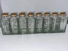 The Glass/Pewter Herb Containers are a set of eight vintage/retro style spice jars made of clear glass. Each container has dimensions of 4.5 inches in height and 1.5 inches in length and width. This set is perfect for organizing and storing herbs or spices in a stylish and classic way, adding a touch of nostalgia to any kitchen. The clear glass material allows for easy visibility of the contents inside, making it convenient to find the right seasoning for any dish. These containers are both functional and decorative, making them a practical addition to any kitchen storage and organization setup. Only 1 is chipped. The Chili one. Please refer to photo.
