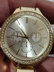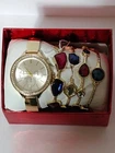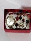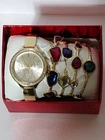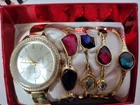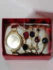 This is a beautiful watch I purchased it simply because of that it's a beautiful gold watch has four beautiful bracelets to go with it Japanese movement no other information available other than you have to do something to the back to remove something to start the battery after something like that. It's brand new in the box and there is a door imported by AEG 1441 Broadway 27th floor New York City. Young ladies are a girls watch beautiful I would think more than for you I mean you can see it...