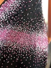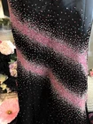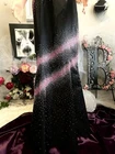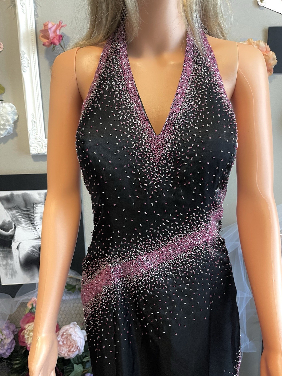 Crafted from a semi-shimmer black fabric, this dress features a unique and flattering design adorned with iridescent pink, lavender, and silver glass beads. The halter-style top includes a built-in bra and is lightly sprinkled with matching iridescent beading, offering both support and sparkle. The halter neckline conforms comfortably to your bust without the restriction of a fixed back or tight material. • Flared bottom adds graceful movement • Fully lined for comfort and coverage • Back zipper closure with secure halter hook * UA-UA (under arm across breast area): 30” Waist: 34” Total Length from top of shoulder to bottom: 65” *Note: All measurements are in inches. Hope your friendly understanding that there might be 0.7" (- +) differs due to manual measurement.