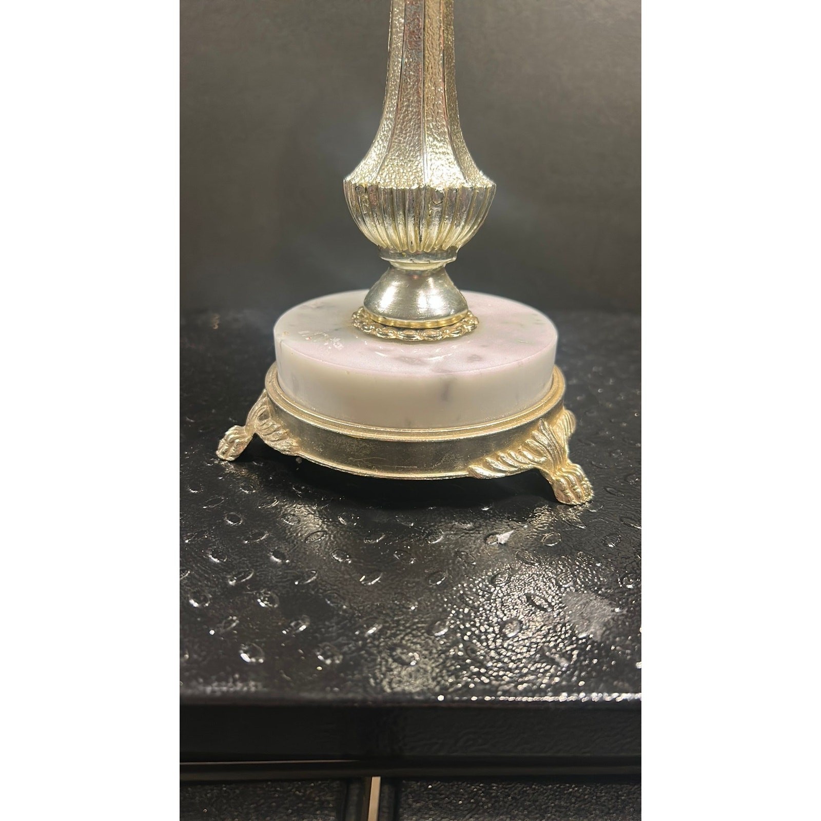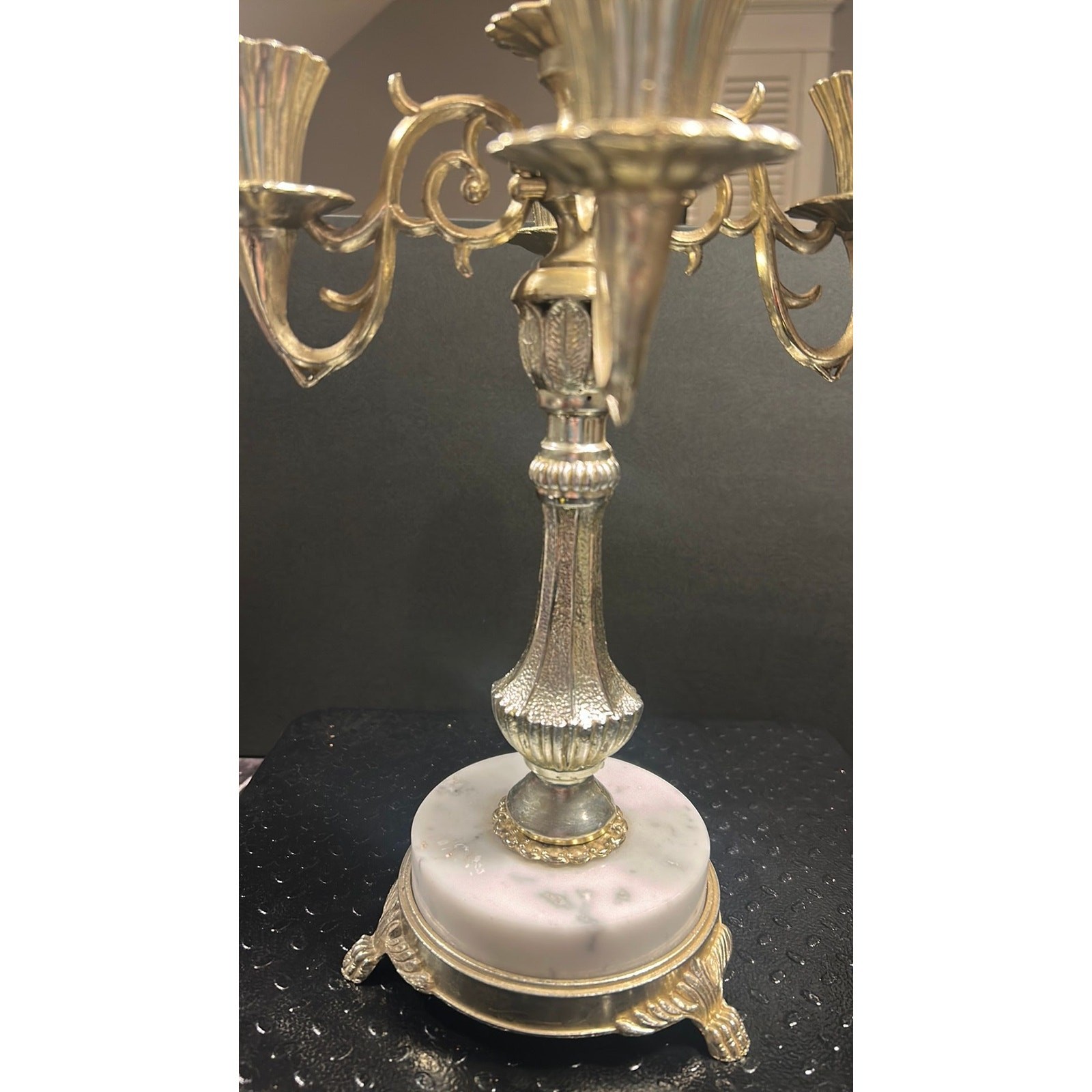 12 inches tall 5 inches wide at base 7.5 inches wide at candles holds 5 candles has both silver and gold tones, doesn't look like wear though, looks intentional which. makes it more versatile super heavy but not brass given color changes