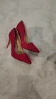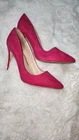 These are pink high heel pumps for women with a pointed toe and a slip-on style. The heels have an ultra-high stiletto heel measuring over 4 inches. They are suitable for many occasions and have a suede-like upper material. The shoes are in US size 10 and have a medium width. They are designed by Dream Pairs and are made in China.