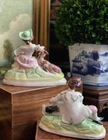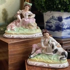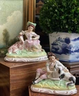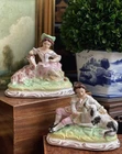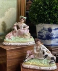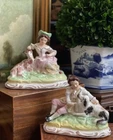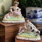 Wonderful Rare Antique English Country Life Staffordshire Mantle Pair Depicting Nobles with Spaniel Dog and Goat Lamb • Elegant English Country Life Staffordshire Pair • 6” Length This pair of stunning English country life themed mantle figures featuring right and left facing noble couple seated on baroque style bases and adoring their precious animal friends (The girl has food in her hand that looks like a carrot or marrow.) will make elegant showpieces when placed on their own or as a stunning addition to a collection or arrangement. These are one of my absolute favorite Staffordshire pairs. They absolutely fascinate me. I never tire of looking at them. Turn of century marks to bases. Marvelous surviving examples from complex moulds. Display ready. Height 5” Length 6” Width 3”