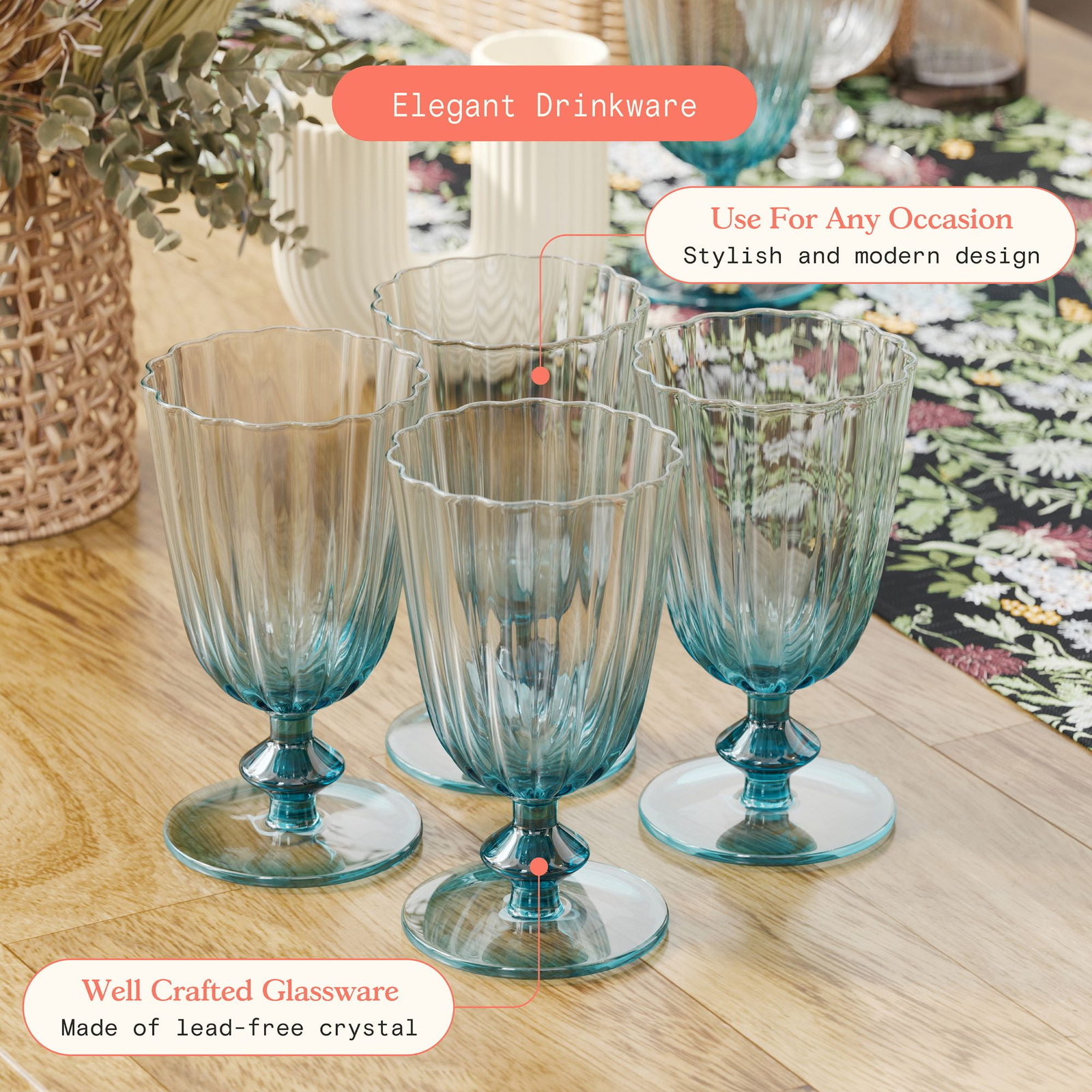 Bring a touch of soft and modern drinkware to your home bar and dining table for all your gatherings with this Beautiful by Drew set of 4 Scalloped Rim Goblets in cornflower blue. Made of lead free crystal, this easy elegant stemware combines casual silhouettes with a classic scalloped design for a stunning look that complements any flatware or dinnerware. Goblets are ideal for everyday enjoyment or entertaining and are perfect for iced tea and water as well as your wines and spirits. Mix and match with other Beautiful by Drew drinkware, dinnerware, and serve ware to create an intriguing tablescape. Set of 4 ach measuring 6-1/2 inches high by 3-3/4 inches in diameter with a 16 fluid ounce capacity. Dishwasher safe. ELEGANT STEMWARE: Beautiful by Drew Scalloped-Rim Goblets in cornflower blue add soft and modern drinkware to your home bar and dining table. Perfect for everyday use and all of your gatherings, combining casual and easy silhouettes with a classic scallop USE FOR ANY OCCASION: goblets are ideal for everyday enjoyment of iced tea and water as well as your favorite wines and spirits at formal gatherings WELL CRAFTED: made of lead-free crystal, this stunning set can be mixed and matched with other Beautiful by Drew drinkware, dinnerware, and serve ware to create an expressive tablescape SET OF 4: each goblet measures 6-1/2 inches high by 3-3/4 inches in diameter with a 16-fluid-ounce capacity EASY CARE: dishwasher safe for quick, thorough cleaning Beautiful Scallop Set of 4 Glass Goblet Blue by Drew Barrymore: 5312839