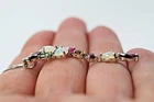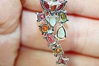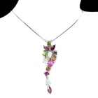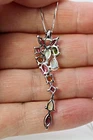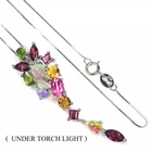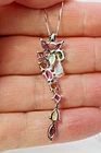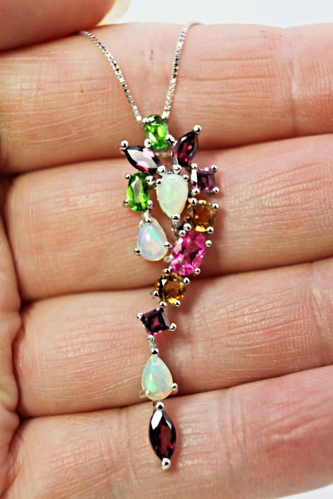 Solid sterling silver 925 stamped white gold coated cluster pendant necklace featuring genuine natural mined gemstones in pink rhodolite, golden yellow citrine, green chrome diopside, white opal with fire flashes and heated pink topaz which are pear and round cut faceted and each measure 3mm x 3mm and 7mm x 3.5mm . The pendant measures 47mm x 13mm and comes complete with a free 18 inch solid sterling silver 925 chain . The necklace weighs 4g / 3.95 carats GIFT BOXED Thanks for looking and please take time to view my other listings #17609