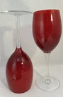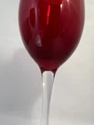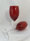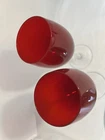 Pair of Ruby Wine Water Goblet Glasses. The rich red bowls contrasted with the clear stems add a touch of sophistication to any table setting. Perfect for all occasions, from Christmas to Valentine's Day. Beautifully weighted & substantial glasses - not lightweight. Crafted from high-quality glass, 8-5/8" in height. The lip diameter is 2-3/4" while the base diameter is 3". Maker unknown. No chips cracks, scratches.