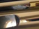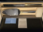 The Waterford two-piece vintage triangle-shaped wedding cutlery set is a beautifully crafted stainless steel piece with a glossy silver finish. Handmade in America in 2010, this mid-century modern styled knife is perfect for special occasions like weddings or all occasions. The set includes a knife with a height of 15 inches and a width of 2.5 inches, making it a unique and decorative addition to any table setting. It is a perfect representation of American craftsmanship and late 20th-century style, ideal for couples celebrating their special day.