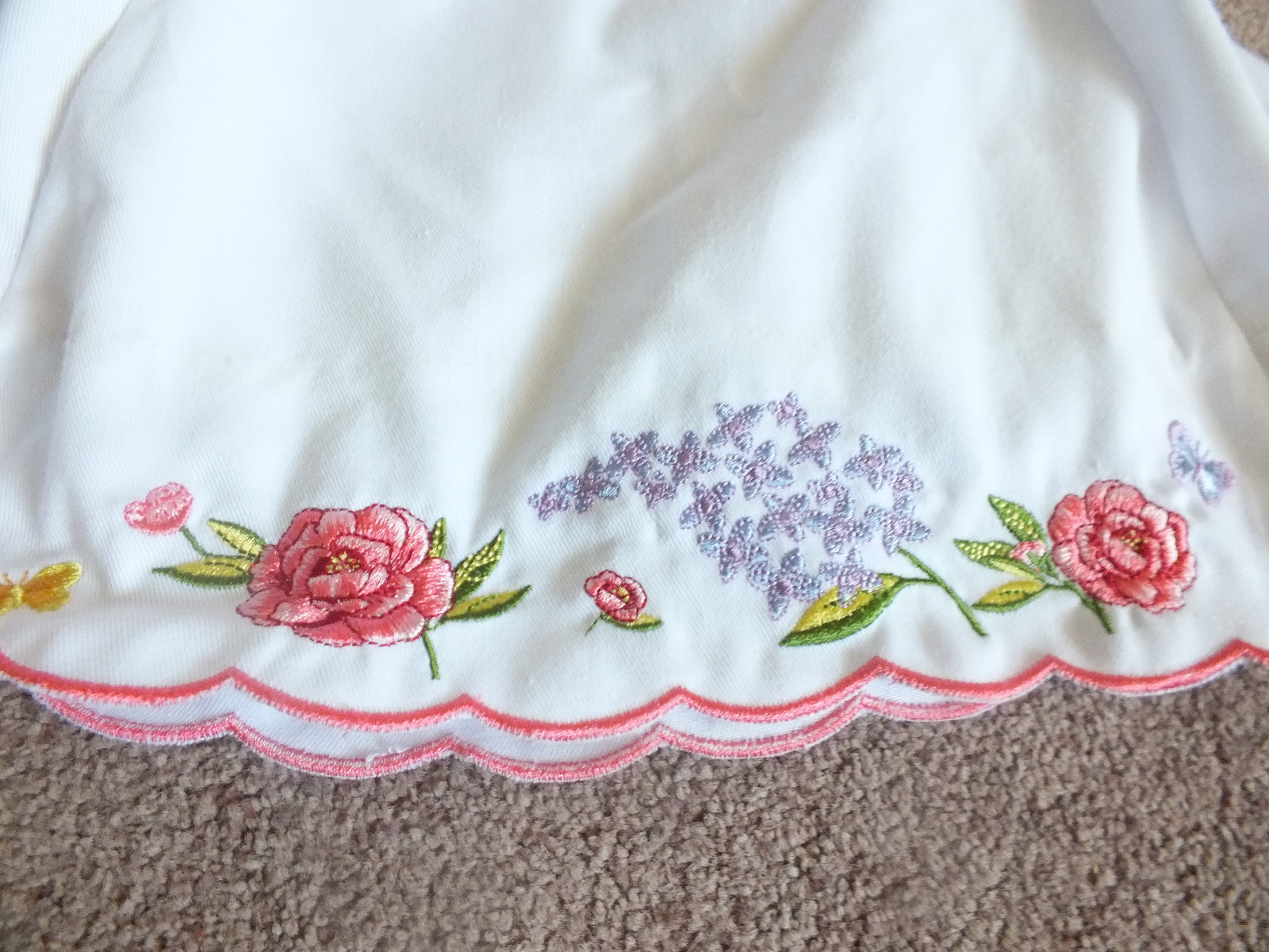 For your consideration is a beautiful machine embroidered appliance cover done in white with pink trim and floral embroidery with an opening on each side for possible handles measuring 11 x 8 x 4 inches in size. Very good gently used condition. Picture does not do justice. Thanks for looking! FREE shipping to the United States. Discounted shipping for International buyers purchasing multiple items. KEEP watching I am always adding linens and have hundreds of pieces of jewelry I am trying to get listed.
