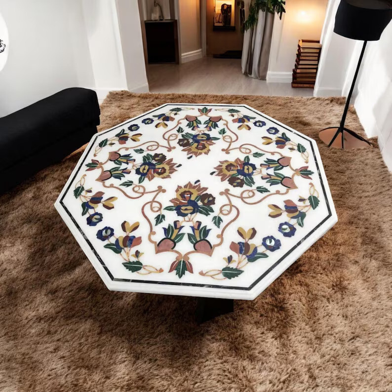 Product Information Size: 24x24 Inches Shape: Octagon Color: White Thickness: 10-20 mm What is Inlay Art? One of the most attractive work of art that comes from marble is"Marble Inlay" work. It is the same work that adorns the Taj Mahal and other Mughal monuments. It is a closely protected traditional art and only a few expert exponents are available today. The delicate process involves cutting and engraving marble shapes manually. To start with, a predefined pattern e.g., floral design or geometrical design is engraved on the marble slab. Small pieces of marble of different shades are cut delicately to fit in these grooves precisely. These small pieces are then slipped in the grooves. Apart from marble, many other materials can also be used. History Of Inlay Art Inlay work on delicate precious stone began in the workshops of Florence in Italy around the end of the 16th century. This was known as PIETRA DURA.(Pietra= Stone, Dura= Hard) The Italians had created a classic artistic form and held a monopoly over it. From 1630 onward pietra dura appeared on movable, small objects as decorative panels, with bird and flower motifs, suitable for cabinet fronts and table tops. Some of these soon reached the Mughals in the form of presents. Of all the Mughal Emperors, Shah Jahan was the greatest patron of architecture in India. For him no amount of money or time was too much to create enduring, everlasting architectural beauty and through it be remembered always. It is in his buildings that one feels most compelled to make the connection between Mughal art and pietra dura. The Taj Mahal, the cenotaphs of the Emperor and his wife, the main floor and the surrounding marble railings bear very close resemblances to the pietra dura form. Process of Marble Inlay Art Master Craftsman carefully plans a design, which is etched lightly into the marble surface and later scored out with an iron chisel. Many of the tools of the trade are basically the same as those used by the Mughals hundreds of years ago. He then decides on the colour scheme depending on the requirements of piece being created. Semi-precious stones and gems are expertly chosen to give just the right graduation in colour and shade for the overall radiance of the pattern. They are shaped and polished by means of an emery wheel. Sometimes heat treatment is applied to certain stones to get a shading effect. The effort involved in making just one single flower can often take days of work, depending on the detail; it is not unusual to be designed from hundreds of different slices of stone. There are many varieties of coloured stone available for utilisation in marble inlay work: malachite, cornelian, jasper, mother of pearl, abalone shell, lapis lazuli, agnate, coral, turquoise and tiger eye to name just a few. The grooves are filled with their precisely corresponding shapes of coloured stone and secured in place with a white putty made from oil, and wax. Once the design is completely dry, the piece is polished with a mixture of sand, water and emery paper to give a shiny smooth finish. This is only table top leg is not included. If you want please feel free to ask us. Thanks For Visting ~~~~