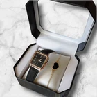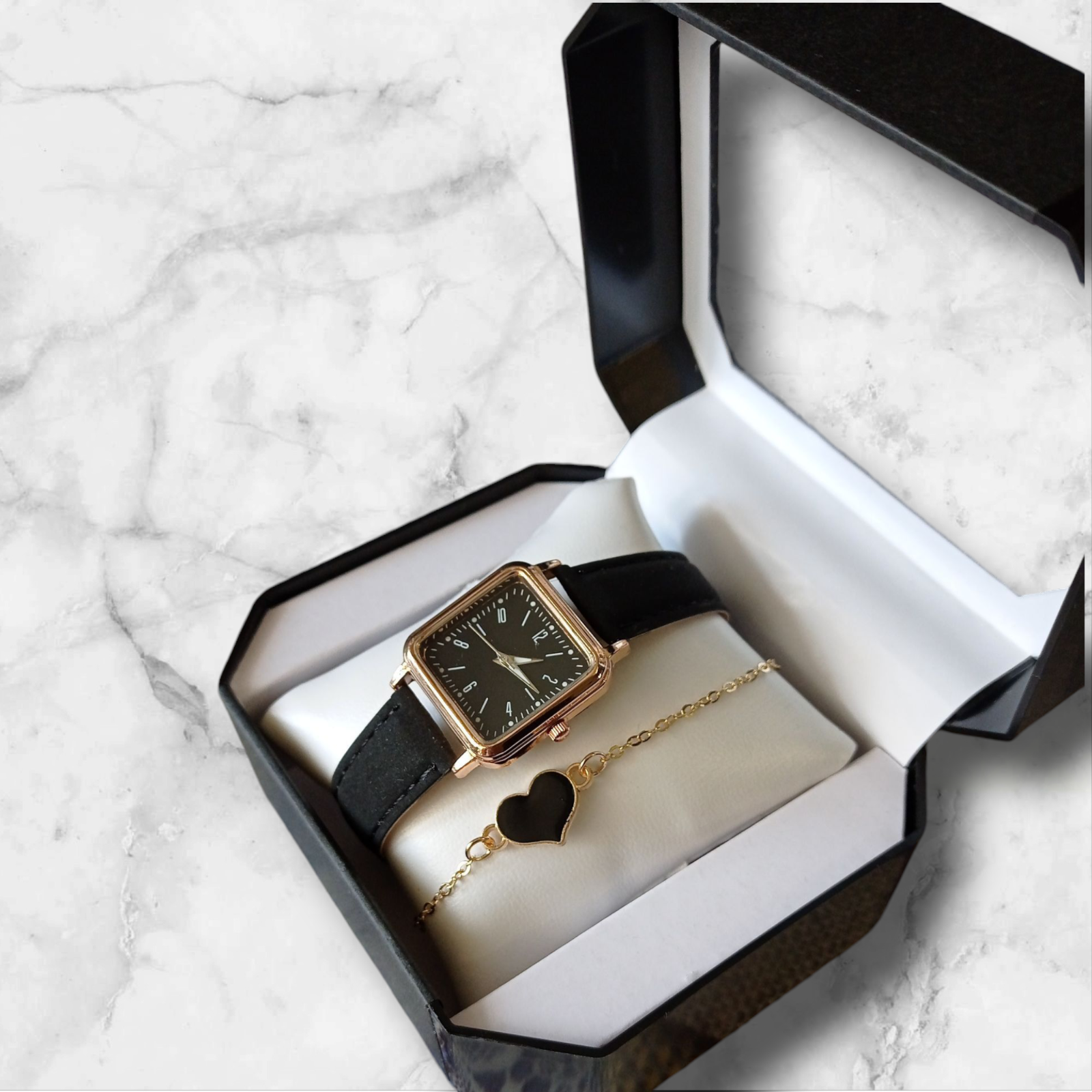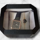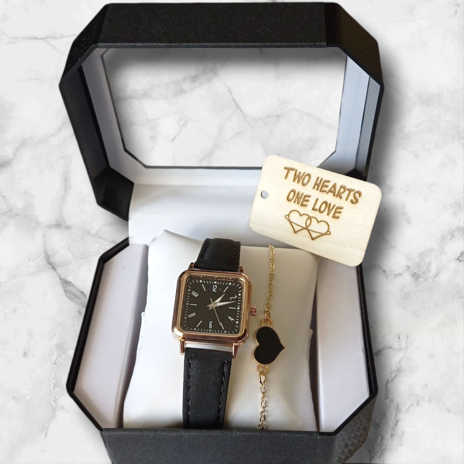 Elegant women’s watch and heart bracelet set – the perfect blend of style and sentiment. This ladies wrist watch features a sleek square black dial, paired with a genuine leather strap for a timeless, versatile look. The set also includes a delicate heart bracelet, symbolizing love and connection, making it a thoughtful gift for sister, girlfriend, wife, or mom. Personalization is included – the wooden tag can be engraved with your own message, date, or name, turning it into a unique keepsake. This makes it a gift for girl, sister, wife, mother, or friend that will be cherished for years. ⏱️ Features: Size: band width: 16 mm (0.6 inch); Band Length: 200 mm (7.9 inch). Case Thickness: 8 mm (0.3 inch). Dial Diameter: 26 mm ( 1.0 inch). Elegant square-face quartz watch with white strap Matching gold-tone bracelet with heart Luxury black watch box included Custom engraved wooden tag for a personal touch Perfect for birthday gift, Christmas gift, anniversary, or special occasion Stylish and versatile design for everyday wear or special events 🎁 GIFT SET INCLUDED: 1x Women's quartz watch 1x Bracelet 1x Gift Box for watch with pillow 1x Custom Engraved Wooden Tag (Natural finish, tied with jute string) ✨ PERSONALIZATION: The wooden tag can be engraved with any message, names, dates, or symbols like hearts. 💡 Example: "With Love, Anna – 04.07.2025" "Happy Birthday, Dad!" "Forever Yours ♥" Simply send message to us with your engraving request and the number of design (look at picture). If you don't send message then I will ship empty tag blank without engraving. Free of customs duties for all US orders, taxes are paid by me. All US orders are shipped DDP (Delivered Duty Paid), no customs fees for buyers.