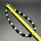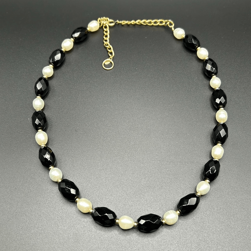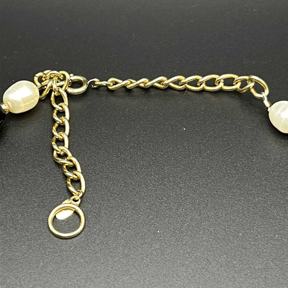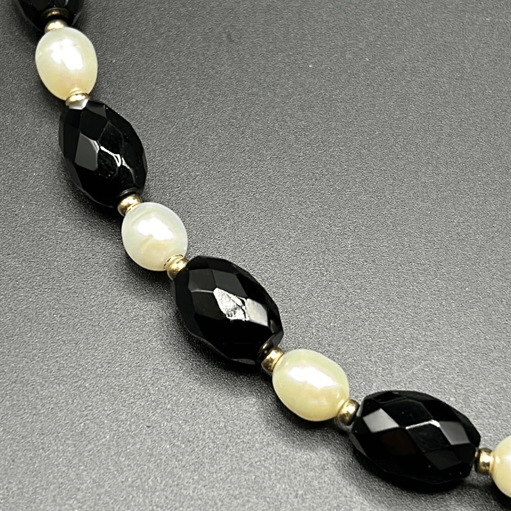 Faceted onyx stones with cultured pearls, and 14K gold spacer beads 14K gold clasp with hangtag marked "Zoe B. 14K" 8" drop with 2.5" extender Great condition