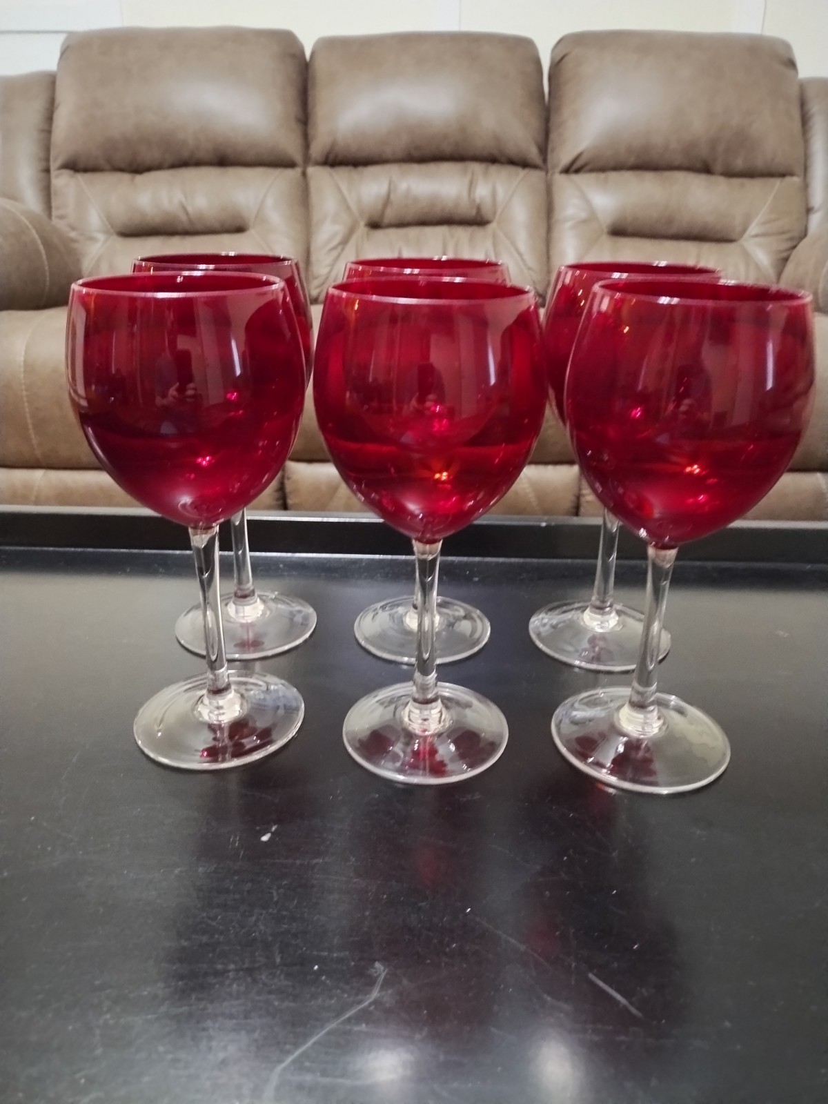 This elegant set of 6 ruby red balloon 8" clear stemmed wine glasses perfect for all occasions. Made with hand-blown glass, these round wine glasses have a beautiful ruby glass production style that adds a touch of sophistication to your table setting. Easy to care for with machine washable instructions up to 85°F, these wine glasses are sure to impress your guests and enhance your wine-drinking experience. All glasses are in EUC without any chips, cracks or sickness. Please ask all questions before bidding. Thanks!