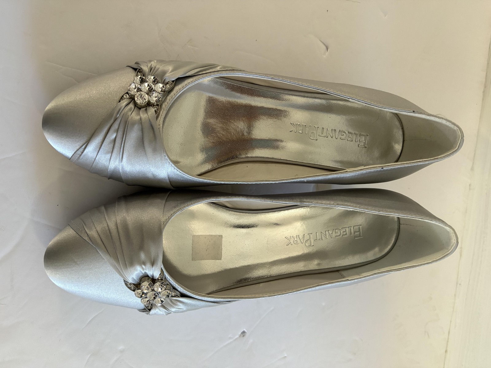 Brand: ElegantPark (logo stamped on insole) Item: Womens dress shoes Style: Closed-toe pumps with low kitten heel Color: Silver Upper: Satin finish with ruched detailing and rhinestone brooch at toe Toe shape: Round Closure: Slip-on Size: Womens Size 8 (embossed "8" on outsole) Insole: Metallic silver footbed with ElegantPark branding Outsole: Smooth, appears unworn Occasion: Bridal, wedding, bridesmaid, evening, prom, formal Identifiers: No UPC/EAN or style code visible in photos Notes: Classic, elegant design ideal for special occasions