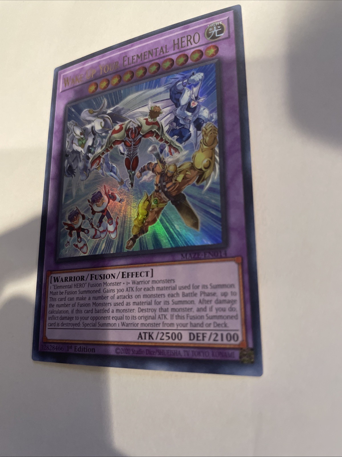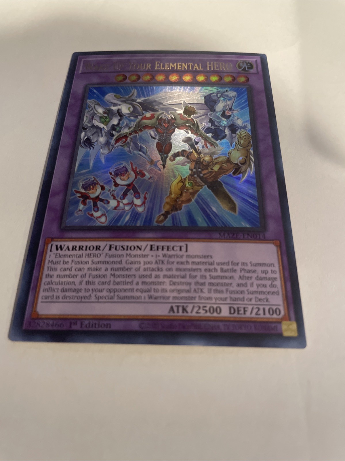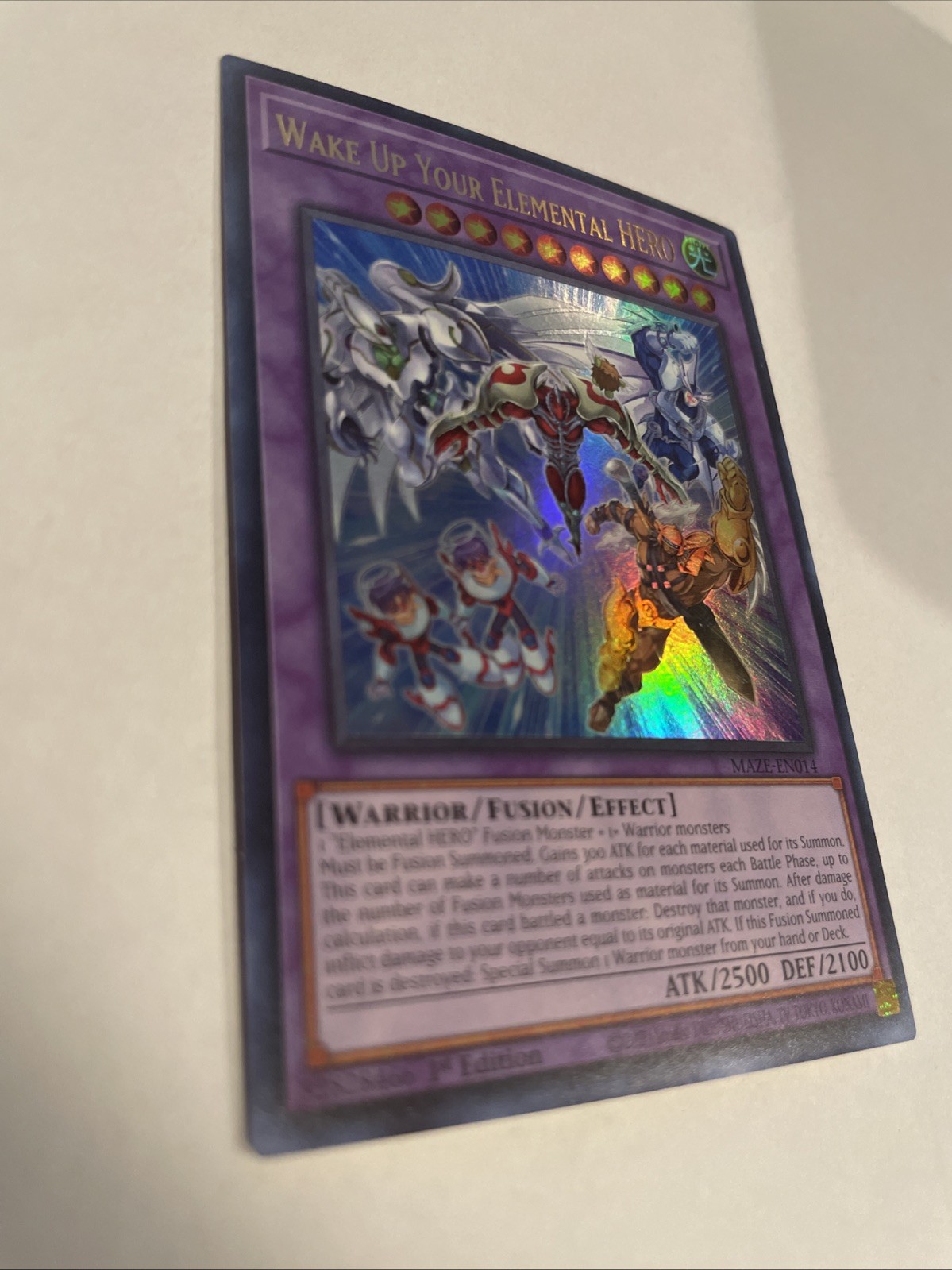 Attribute/MTG:Color:LightCard Number:MAZE-EN014Set:Maze of MemoriesAttack/Power:2500Level:10Creature/Monster Type:WarriorCard Text:1 "Elemental HERO" Fusion Monster + 1+ Warrior monsters