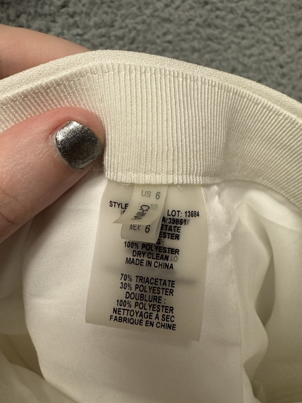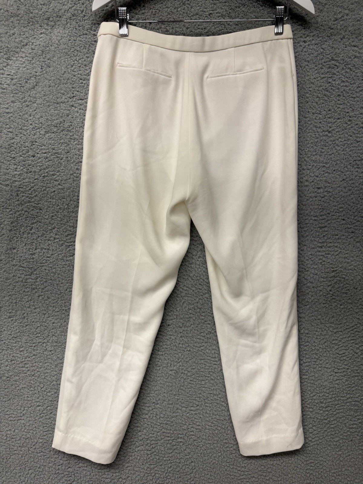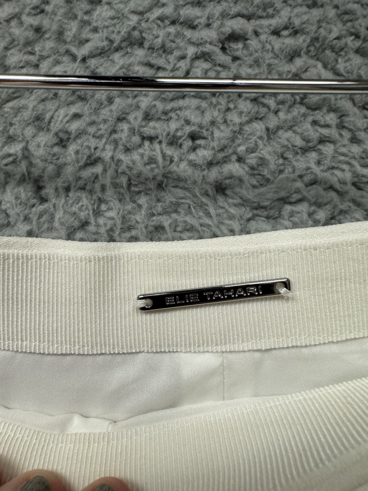The Elie Tahari White Dress Pants in Women's Size 6 feature a flat front design with a high rise and a skinny leg style. Made from a blend of spandex, viscose, and linen twill fabric, these pants offer a stretchy and comfortable fit. Ideal for various occasions such as parties, casual wear, and business meetings, they have a sleek and modern look perfect for the summer, fall, and spring seasons. With a white color and solid pattern, these pants can be styled with different tops and shoes to create versatile outfits for any occasion.