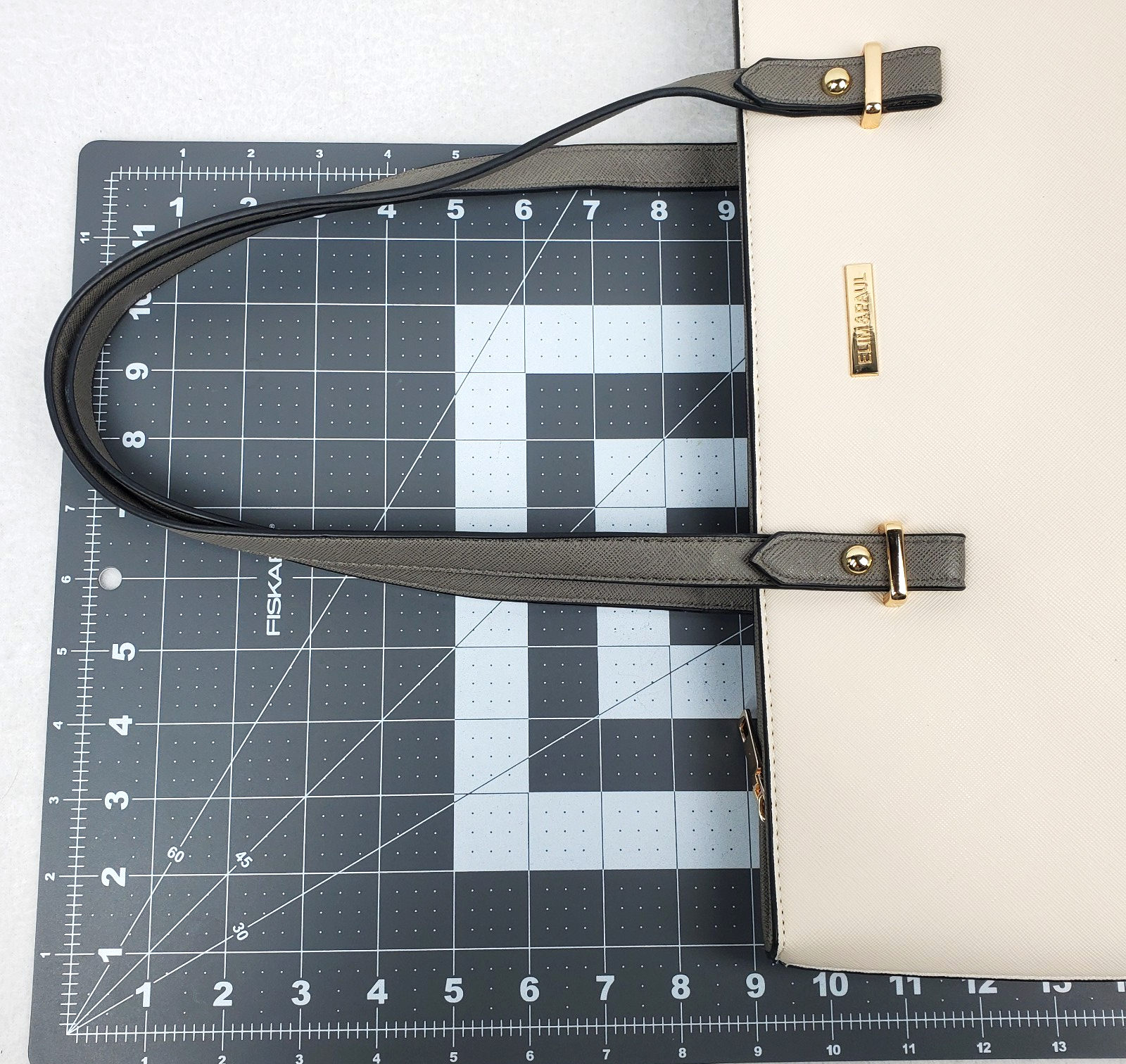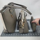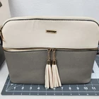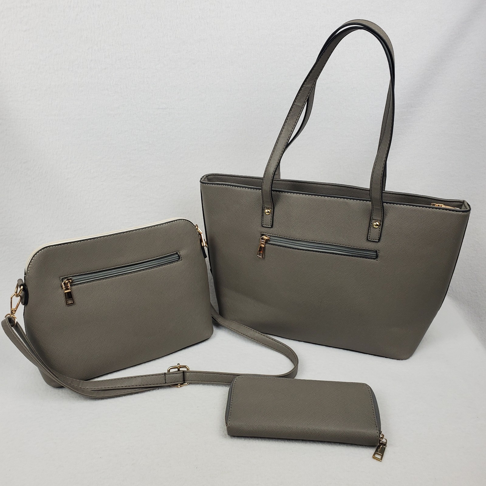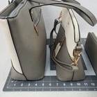 Elim & Paul 3 Pc Set Handbag Tote 16" Crossbody 11" Wallet 8" Cream Gray/Gr NWOT NWOT complete 3 piece set. Tote, crossbody, wallet, please view all pics. Larger Purse Tote Approximate Measurements: Height: 10 in Base Width: 13 in Top Width: 16 in Depth: 5 in Double Handle Drop: 9 in Medium Crossbody Purse Approximate Measurements: Height: 8.5 in Width: 11 in Depth: .4 in Crossbody Strap Drop: 9-20 in Wallet Approximate Measurements: Height: 4 in Width: 8 in Depth: 0.75 in This Elim & Paul handbag set is a must-have for any fashion-forward woman. The set includes three pieces - a small-sized wallet inside a small/medium crossbody bag, and contained within a medium/large handbag tote. All bags are made of high-quality faux leather in classic cream and gray/green front color blocking with gold hardware accents. The interior lining material is soft fabric that adds a touch of elegance to these bags. The set features a designer pattern and is perfect for any occasion. The bags have a zip closure and a faux leather handle/strap material that matches the exterior material. The set is ideal for women who want to add a touch of sophistication to their wardrobe. Get this NWOT set today and elevate your style game.