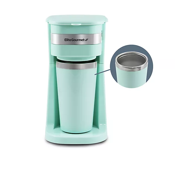 Drink hot, delicious coffee everyday with this single-serve coffee maker. Small enough to accommodate your home, office, dorm room, or trailer. From Elite Gourmet. Includes coffee maker, reusable filter, and 14-oz stainless steel travel mug 700W total power Dishwasher-safe components: covered mug and filter basket Measures 6.88" x 5.11" x 9.64"; Cord 25"L ETL listed Imported